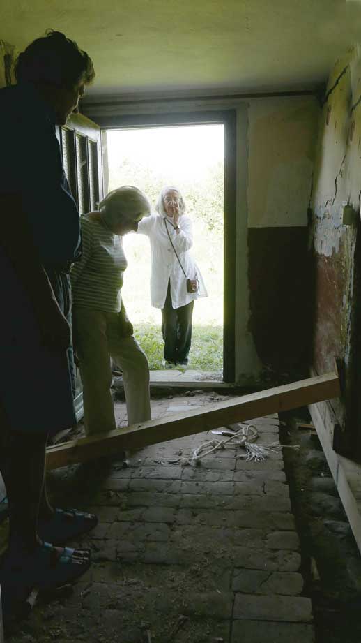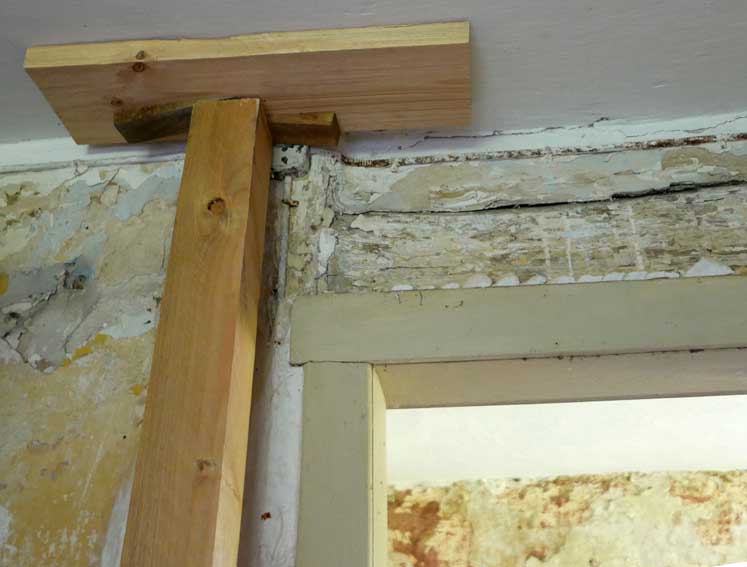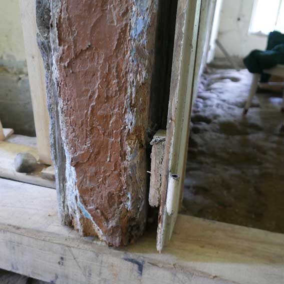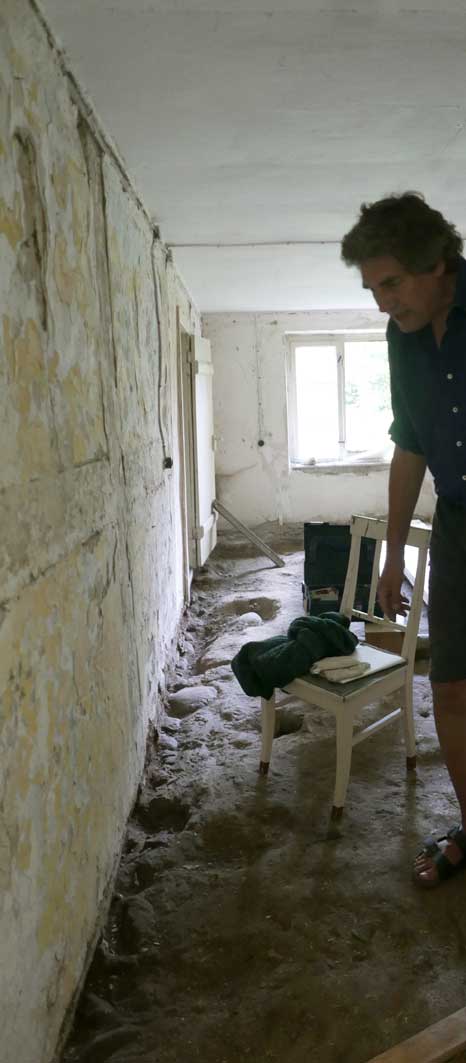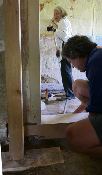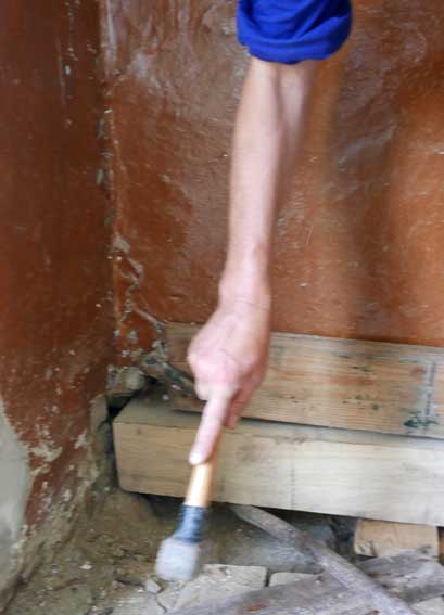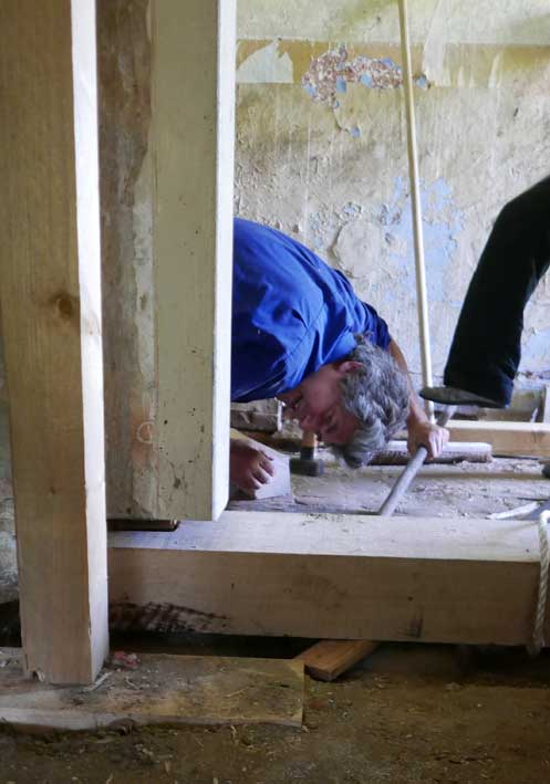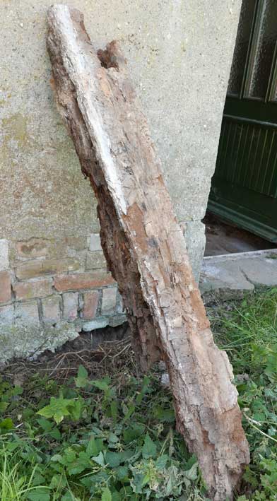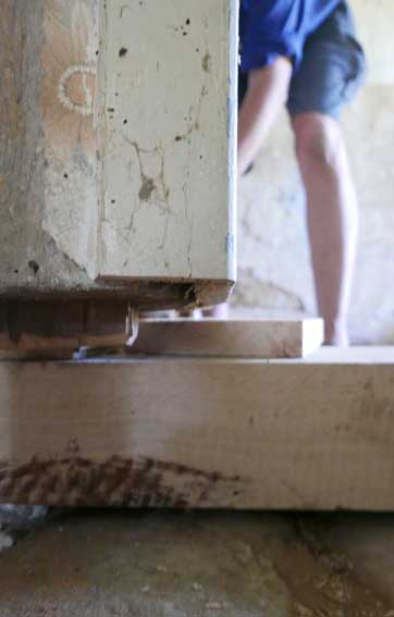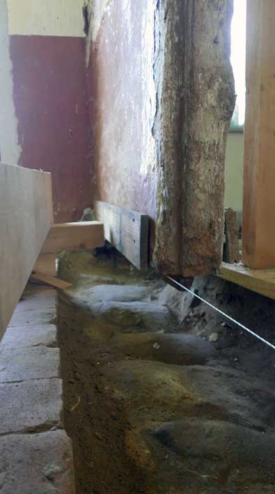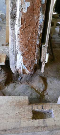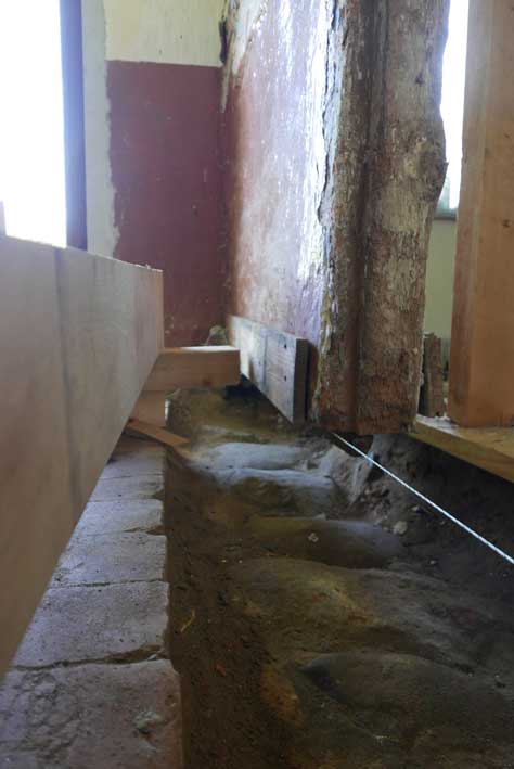 sind mit neuem Grundbalken zu versehen. Eiche. Und mit neuem Zapfen. für die senkrechten Balken von oben. Alles auf den Feldsteinenfrei gelegt.