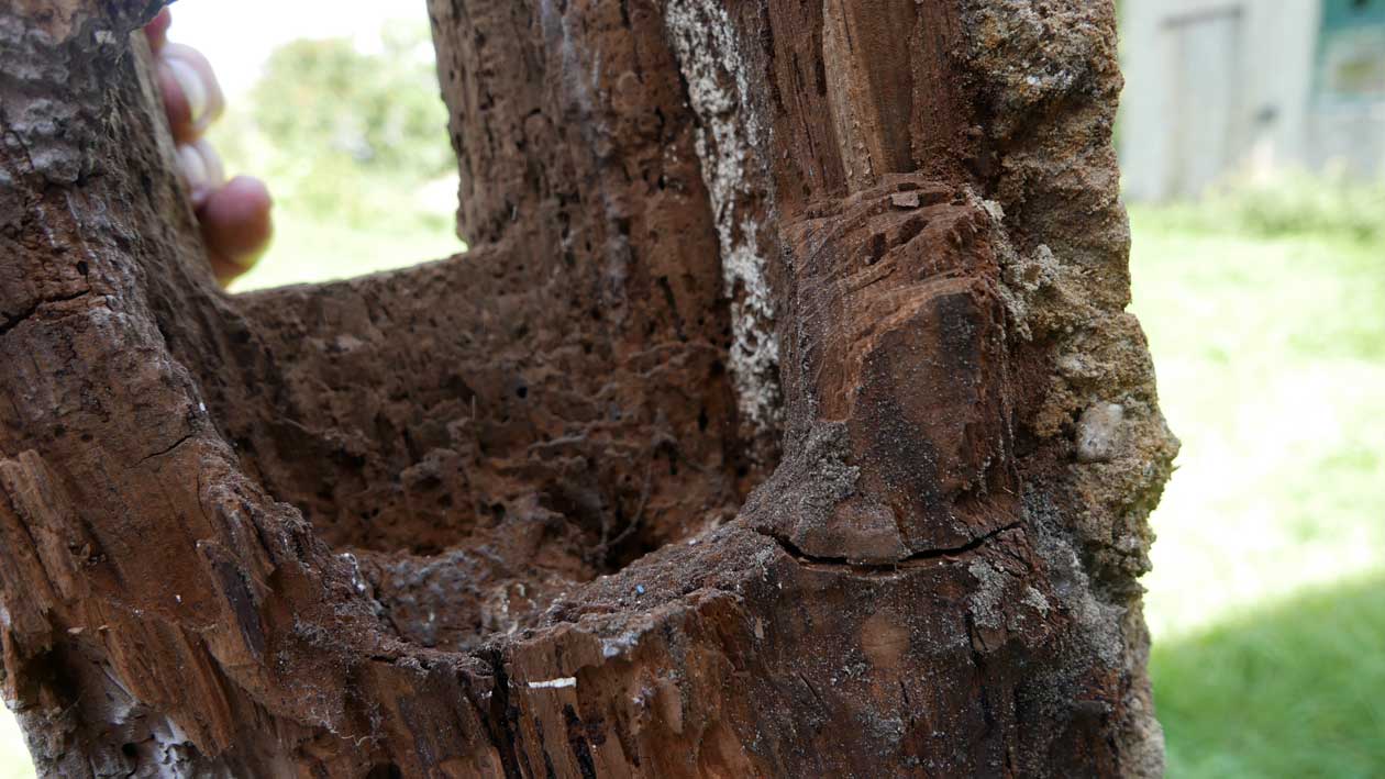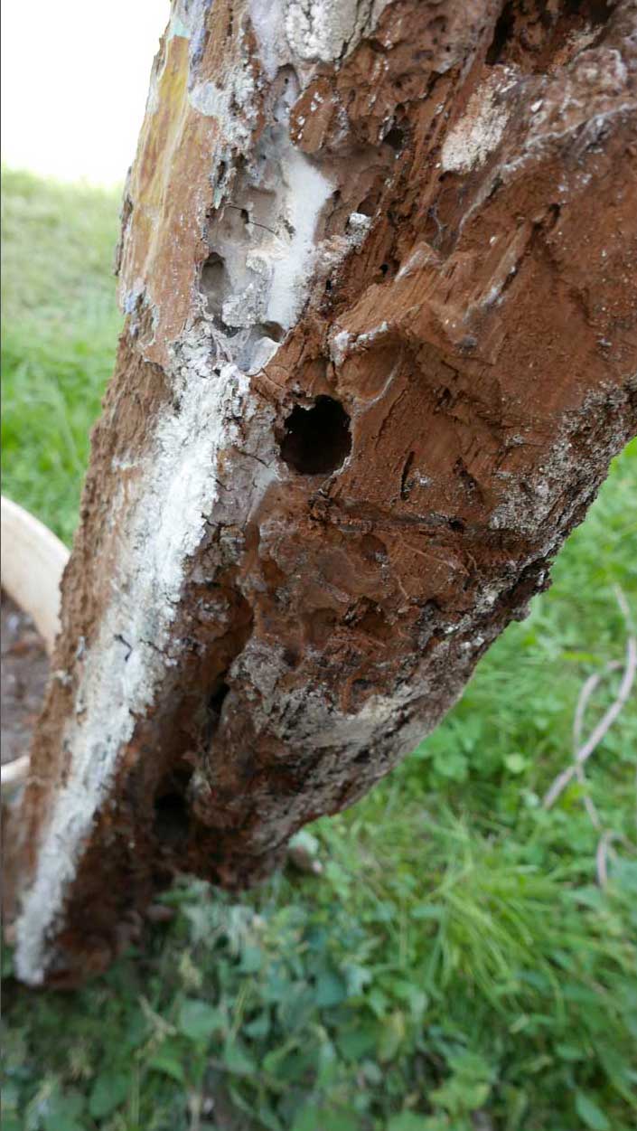 Ausgraben den morschen Balken, rausschachten das neue Bett, reinziehen den neuen Balken, die Löcher für die Zapfen ausstemmen reinpassen das Ganze. Allein.