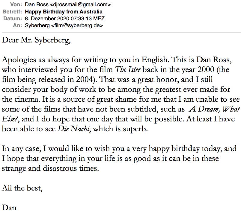 Als er kam einen Film über die Donau zu machen mit viel Hölderlin, war, mitte der 90er Jahre sehr viel anderes wichtiger zu überleben. Der Film entstand und kam viel rum. Nun kommt er so zurück mit den richtigen Worten als erster des Tages.