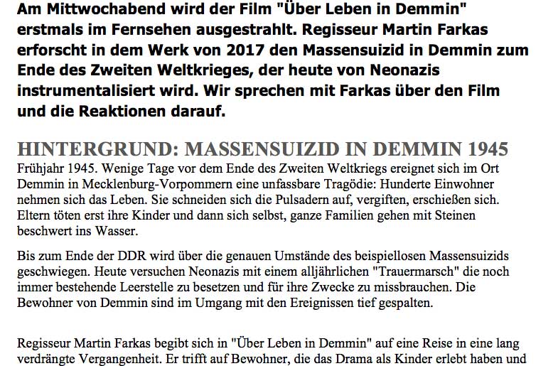 Der wirkliche Missbrauch geschieht durch so genannte Aktionsgruppen 8. Mai, die die Toten einordnen in ihr System als Opfer durch eigene Schuld oder der Propaganda und damit ins weitere Vergessen schieben. Als Medienfutter ihrer Hirnwäsche zugunsten eigener Jubelfeiern einer Freiheit, die sie bunt nennen mit aufgeblasenen Sexpuppen als Wasserleichen aus Plastik durch die Peene zur Mündung zu treiben.
