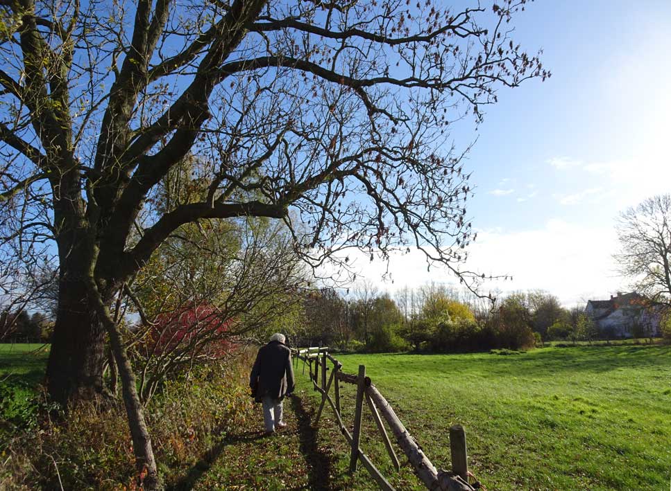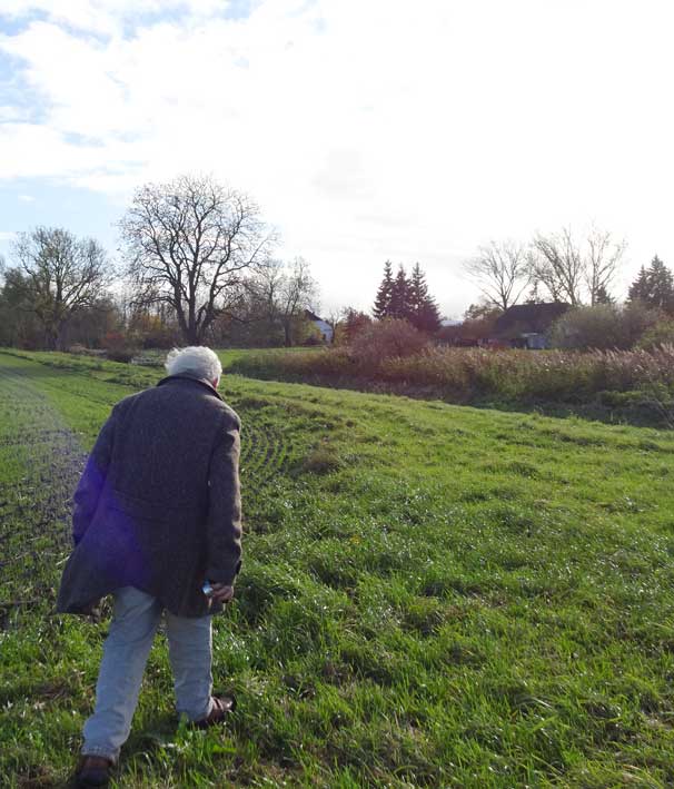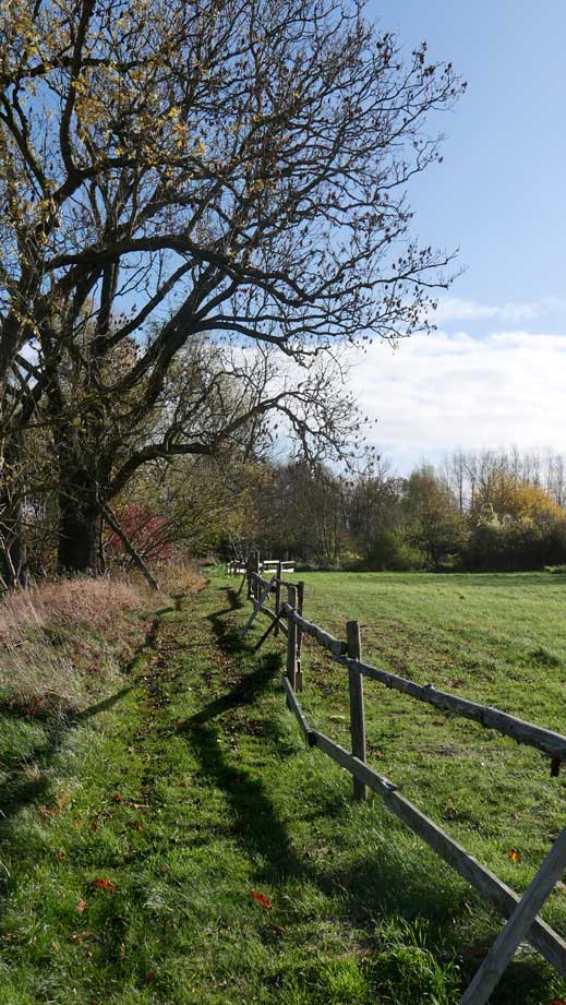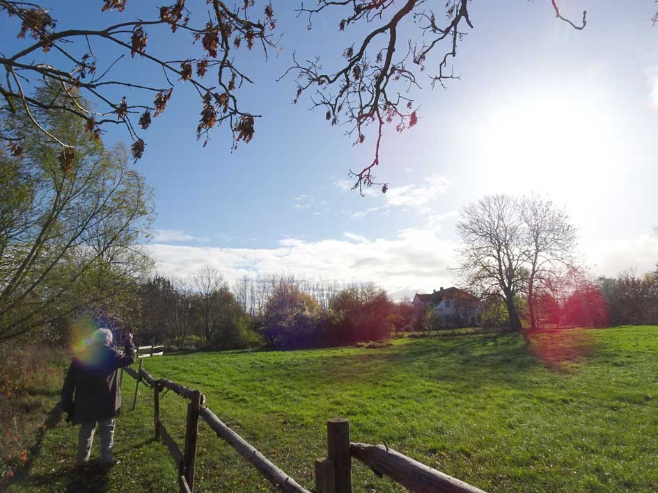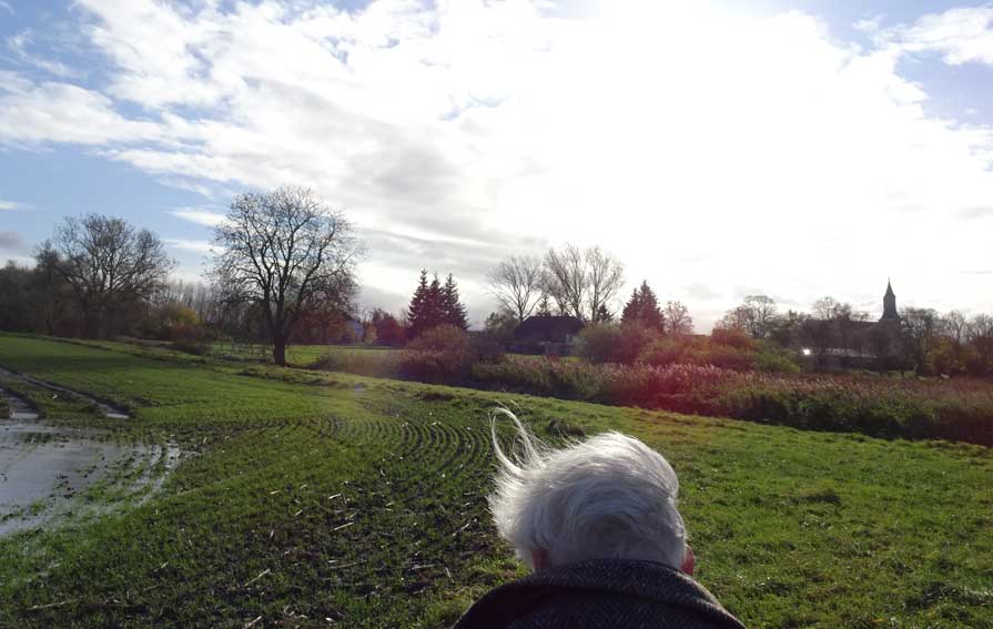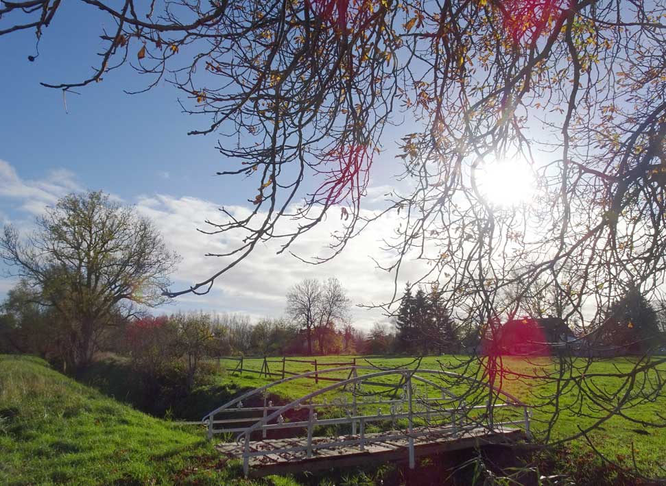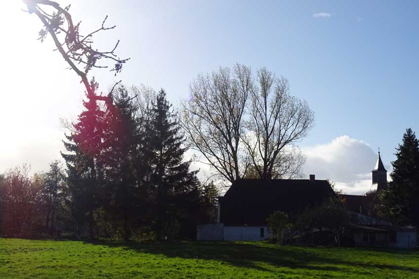 Uns aber ist der Anblick lieb. Die Häuser gegenüber und die Koppeln mit dem so gebildeten Teich zusammen.