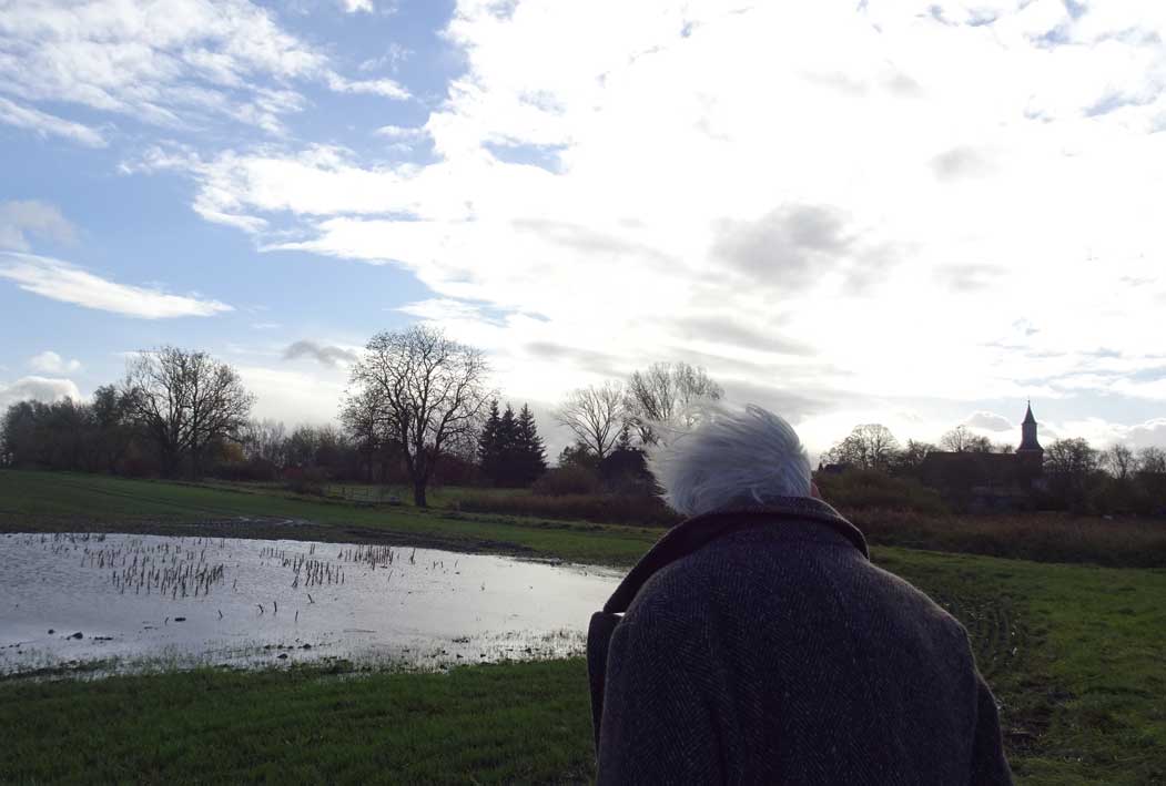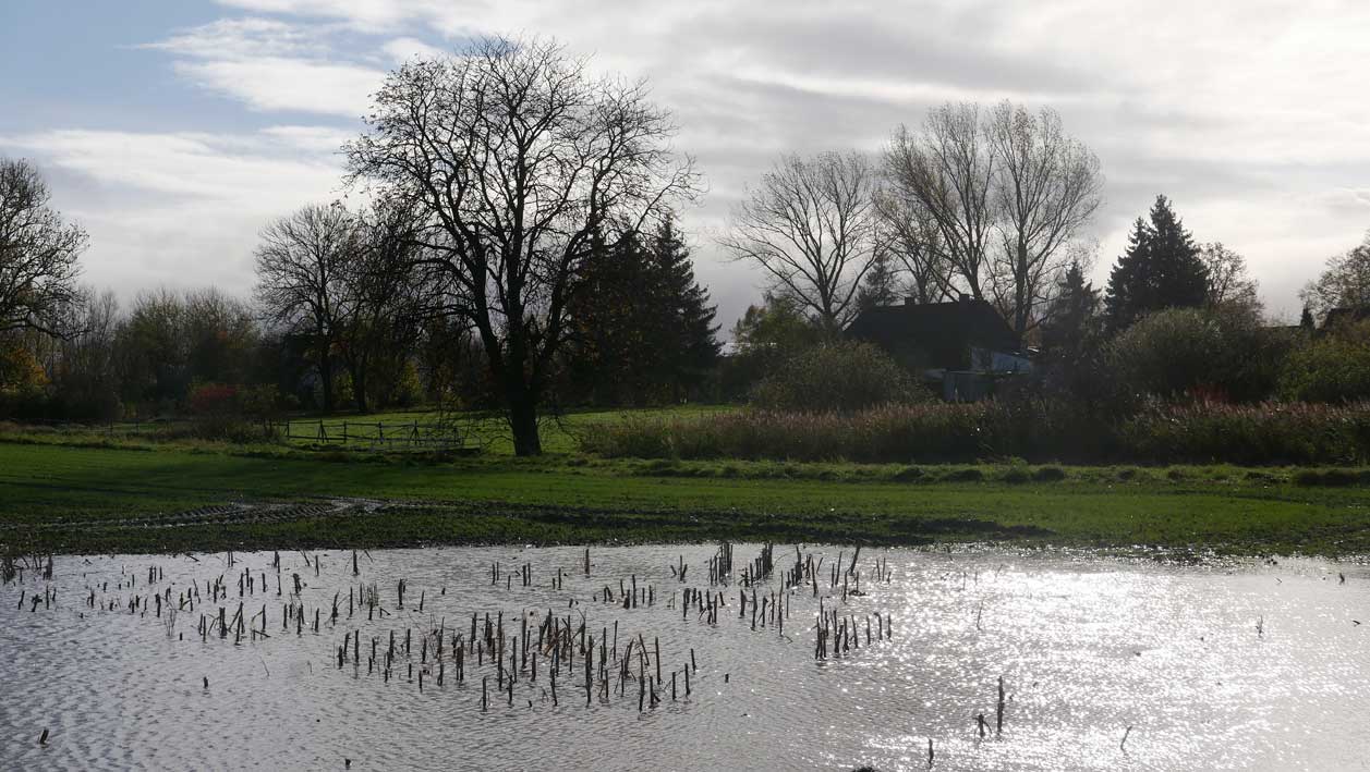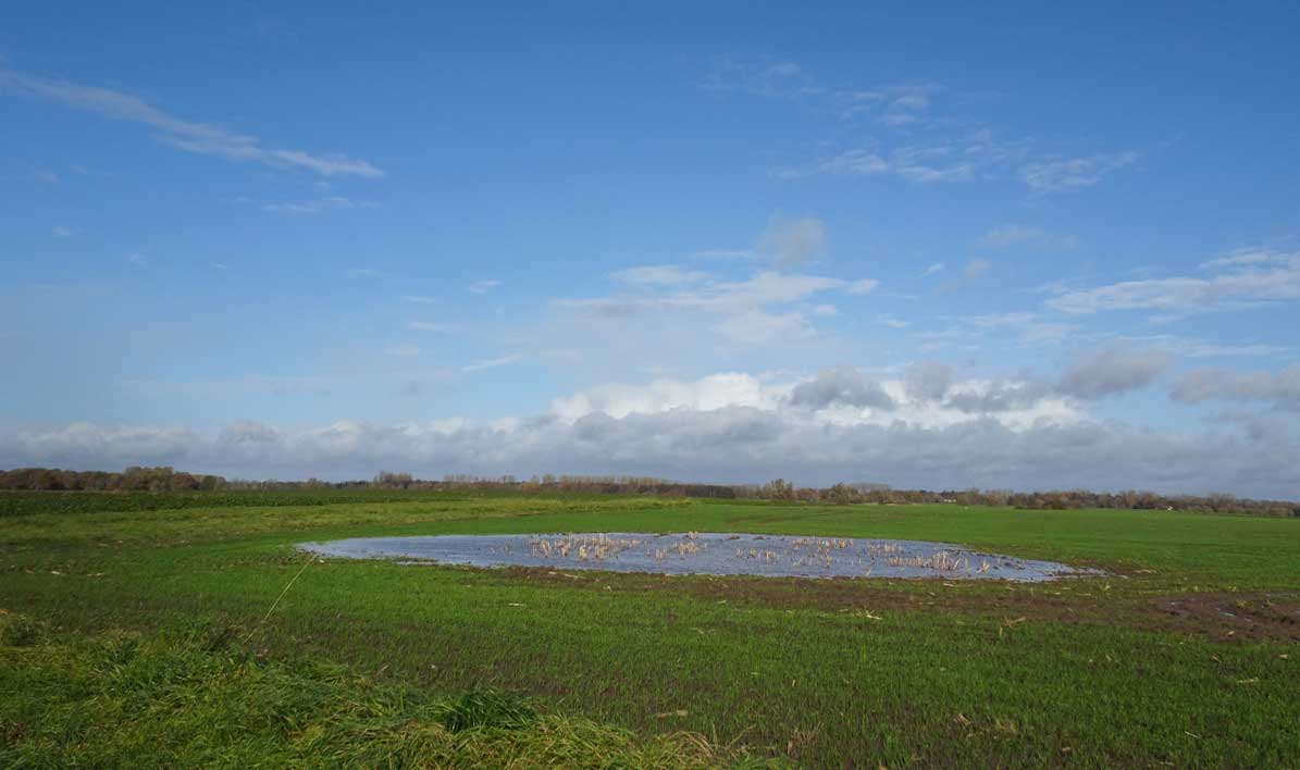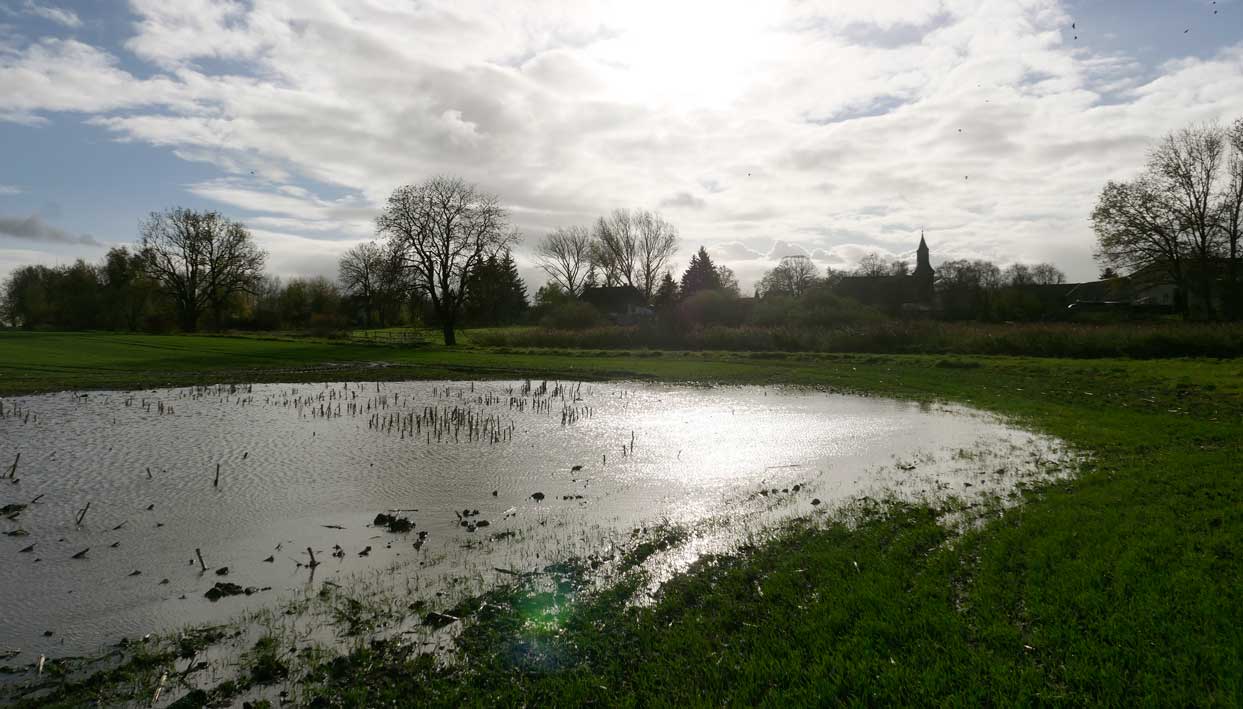 Dieses Wasser auf den Feldern hier ist nicht gewollt. Es bildet sich, wenn die Rohre unter dem Acker defekt sind, denn die Felder sind durch ein Dränagesystem trocken gehalten, damit darauf die Saat ensteht.