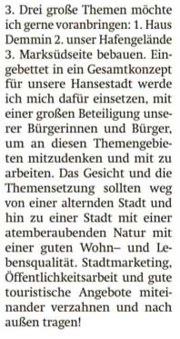 In dem Intelligenzblatt des Nordkurier in Demmin die Meldung, dass der neue Bürgermeister-Kandidat der CDU den Markt in sein Wahlprogramm aufgenommen hat. Gegen den NK. Neben anderen Themen. Werden sehen wo mehr Leben drin ist.