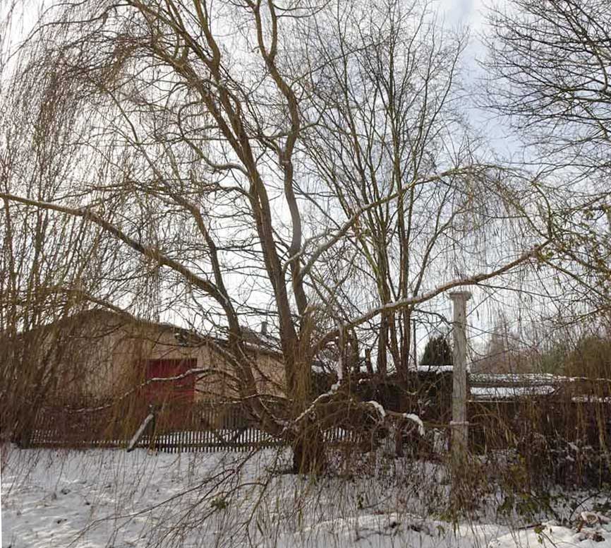Der Zaun aus Holz am Graben an der Kastanie zur Brücke, wo es zum Wald geht hinten , dem Graben von 1945 entlang zur Trebel.