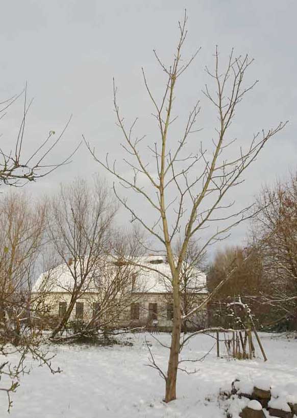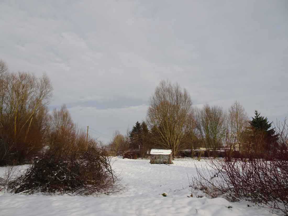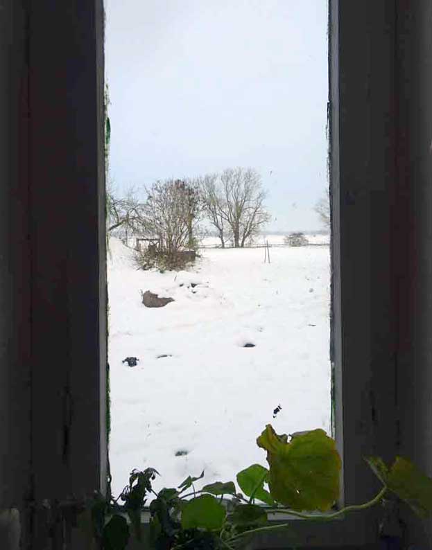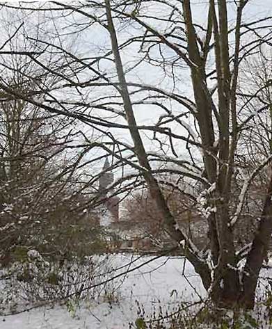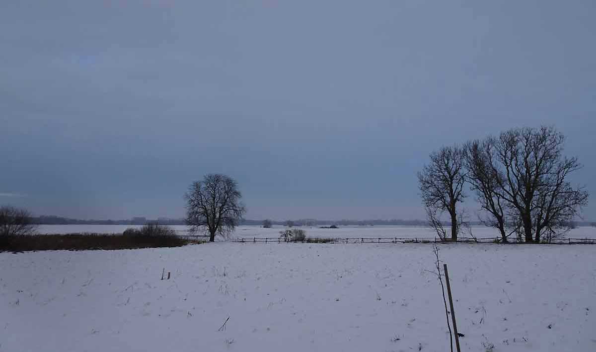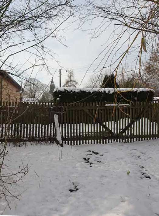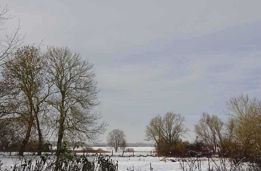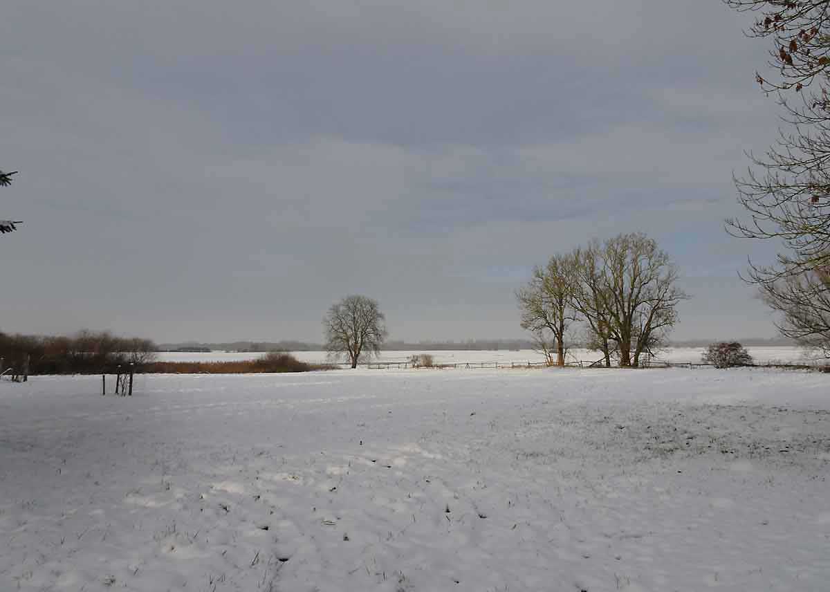 und das Andere zur anderen Seite nun im weissen Gewand im weissen Schnee. Der Koppeln und Felder bis zum Wald.