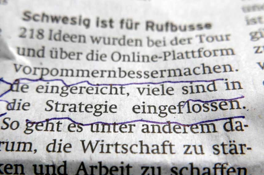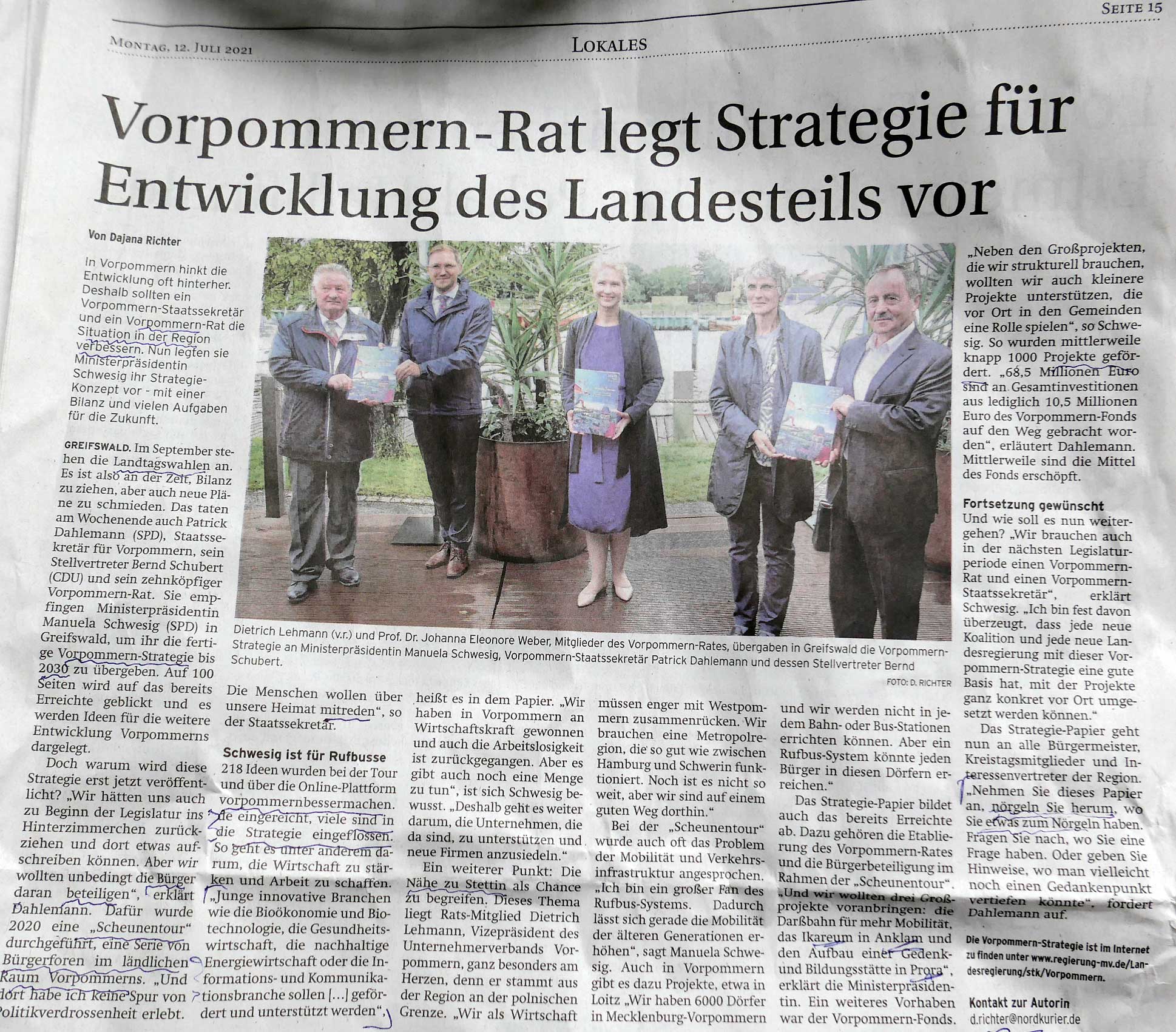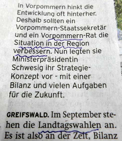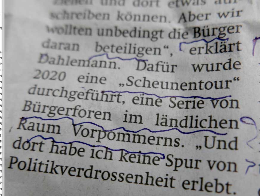 Im letzten Herbst gab es den Aufruf aus Schwerin mit der Devise Vorpommern besser zu machen. Da konnten alle mitmachen. Am Ende ergab sich obenan landesweit das Interesse an der Wiederherstellung des Marktes in Demmin nach 1945. Vorher hatte der Vorpommern Fond diese Initiatve in Demmin mit Geld unterstützt. So die Installation des bekannten Cafe Zilm auf Zeit und die Aufführung des Requiems von Mozart sowie die Herstellung einer Machbarkeitsstudie zur Wiederherstellung des Markts selbst. Davon lesen wir jetzt nichts. Das empfohlenn Booklet dazu enthält dann sicher etwas davon. Die Internetadresse, wie hier angegeben, ist jedefalls leer, wenn von der Zukunft Vorpommerns gesprochen wird. Denn dafür ist das Geld gegeben und dafür wurde hier abgestimmt. Und dafür die Proben in den Sommern Demmins der letzten 6 Jahre. Das ist auch ein Modell wofür. Heute und zentral.