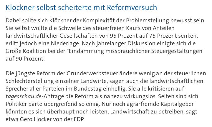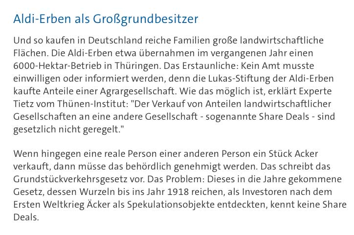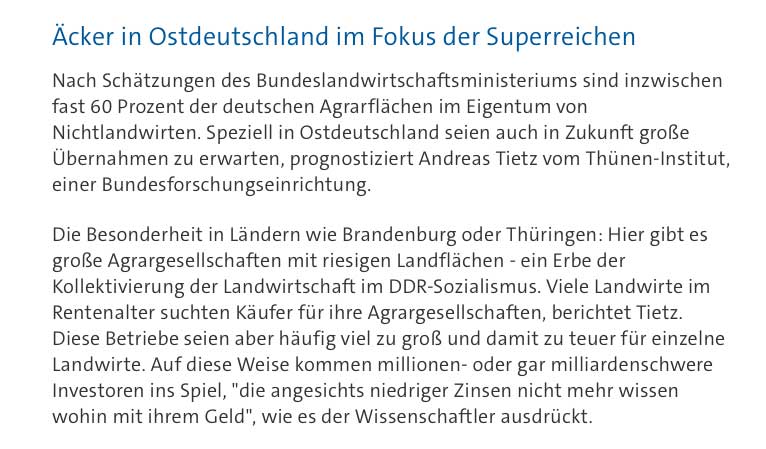 Als 1989 die Ergebnisse der DDR-Enteignungen auf dem Lande vom Westen festgeschrieben wurden, geschah das auch mit den Argumenten die gesellschaftlichen Neuverteilungen nach dem Kriege nicht durch neue Umschichtungen rückgängig machen zu wollen und neue soziale Gefüge, wie sie damals entstanden waren, nicht zu revidieren. Nun sehen wir die Folgen. Neue Gross-Grund-Verhälnisse in industriellem Ausmasse wurden geschaffen und möglich, durch staatliche EU-Förderungen begünstigt, dass Fragen der Schäden für die Umwelt und den Menschen und Tiere offen sind. Die globalen, ja planetarischen Auswirkungen beschäftigen heute Politik und das Gewissen der Menschen wie nie.
