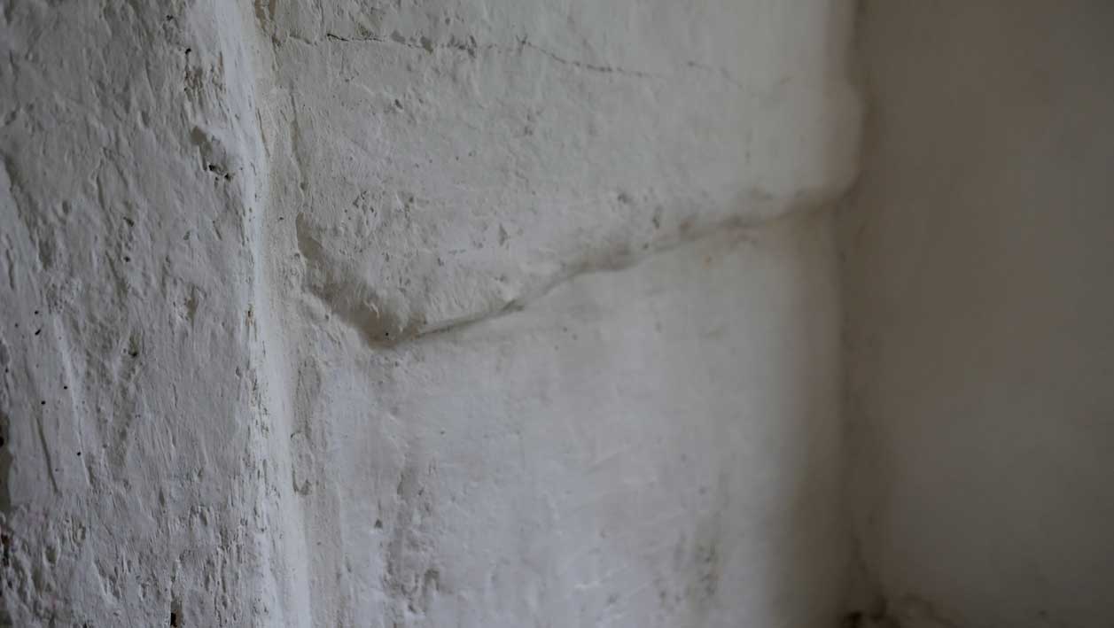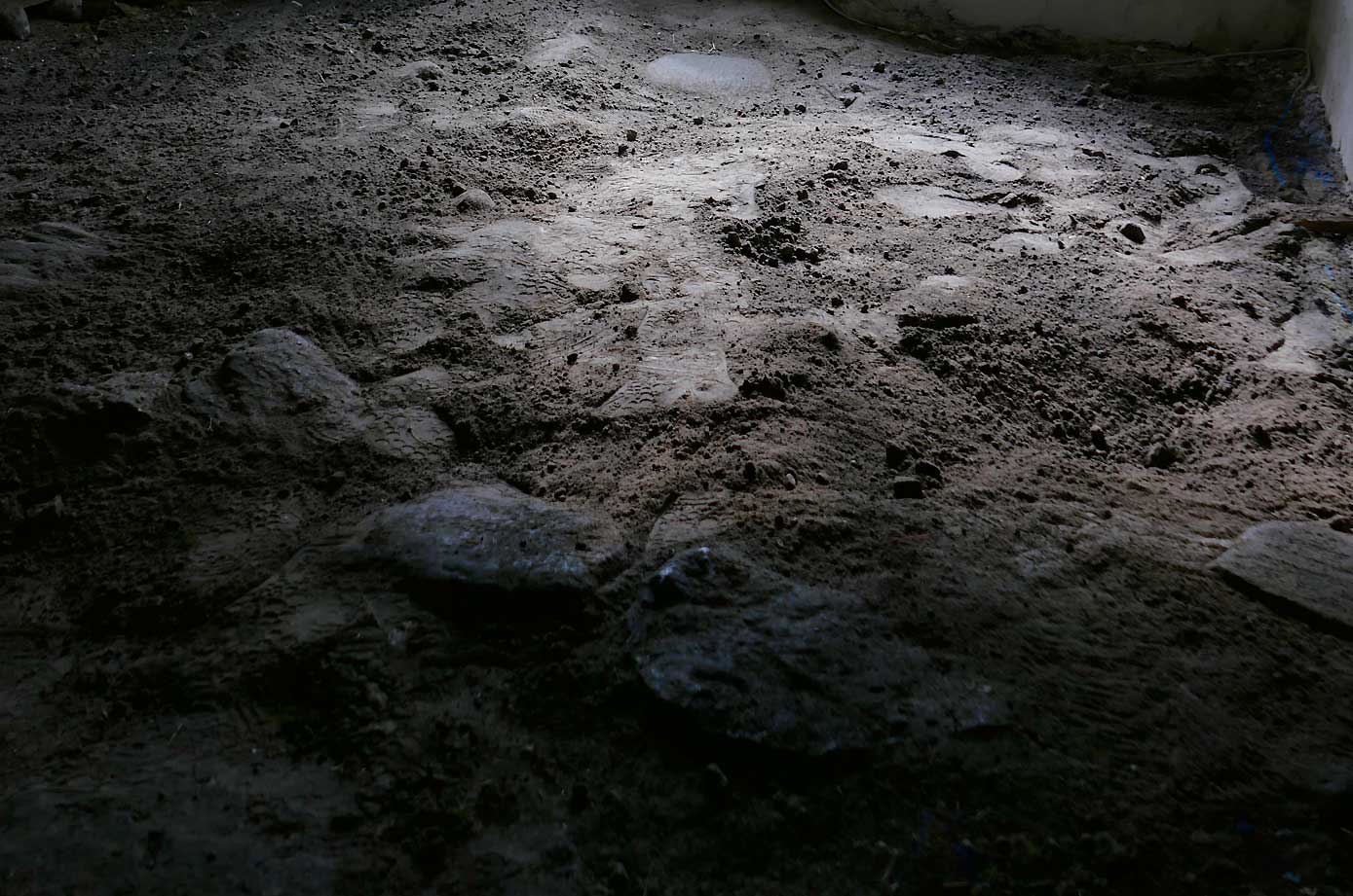 nochmal an den Tatort des vorigen Tages . Das Gestein als ob es hinüberführe aus dem Nebenraum rechts durch die Wände in die Tür links