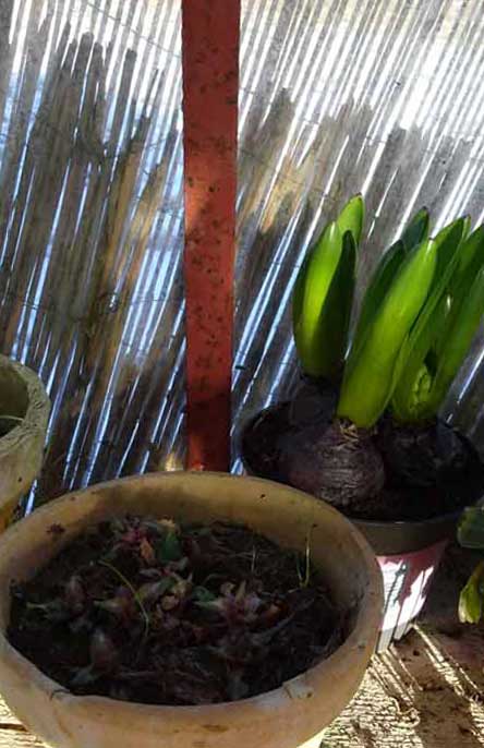 der Sonne am Fusse alten Scheune wo das Grün herauskommt sorfort unter dem Schnee. Jedes Jahr.