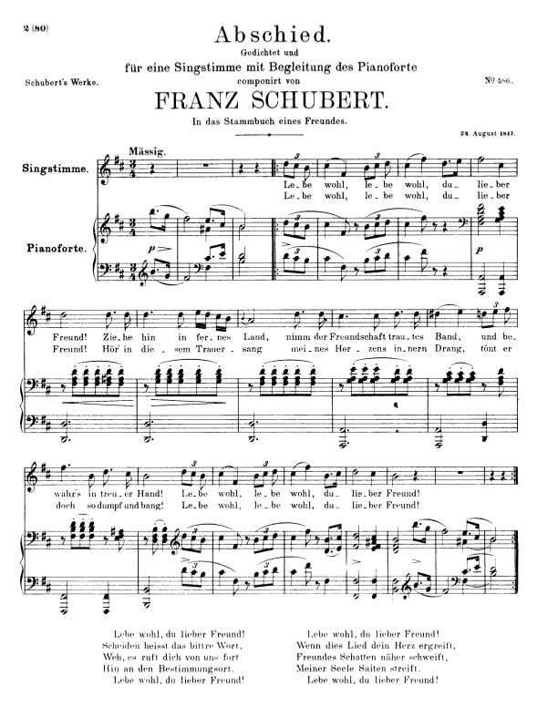 Schubert D 578, hier stammt auch der Text von ihm. Er schrieb es, als Franz von Schober 1817 aus Wien fortgeht :Der Klaviersatz ließe sich auch sehr gut von einem Akkordeon übernehmen. Ansonsten könnte ich auch etwas mit der Musikhochschule in Rostock organisieren. Ich würde auch ein Arrangement schreiben, falls benötigt. Bariton + 3 Bläser.
