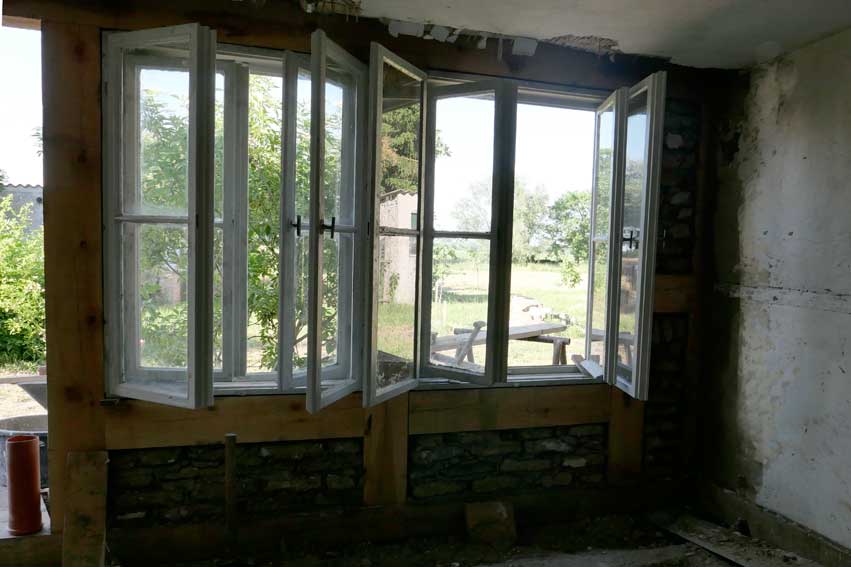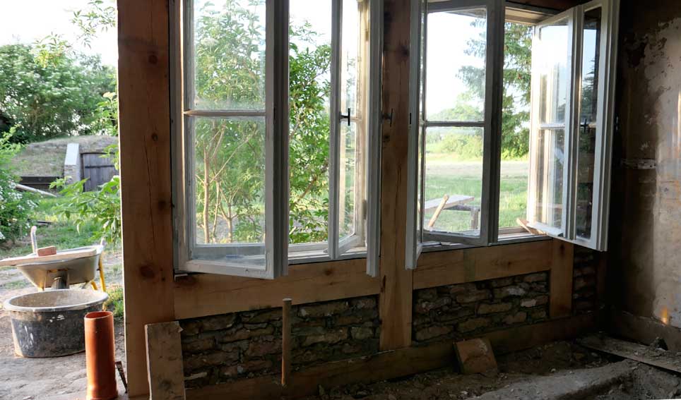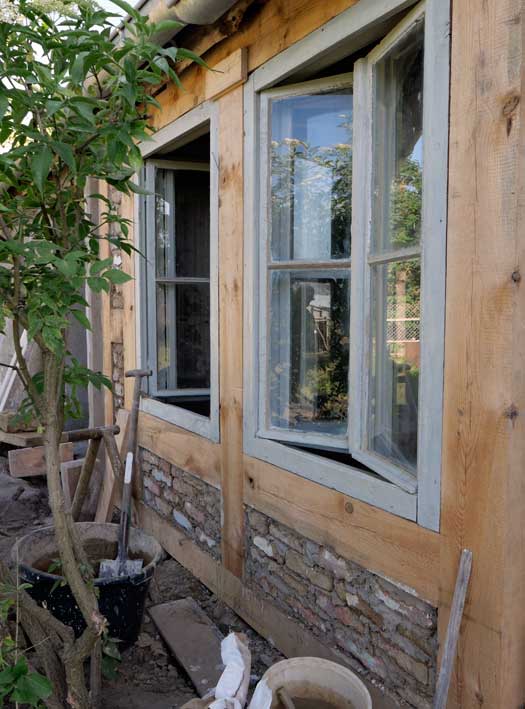 Die neue Aussenwand mit Fachwerk gemauert nun zwischen den neuen Fenster mit alten Lehmziegeln des Hauses von anderen Stellen, Steinen, die die dafür frei wurden.