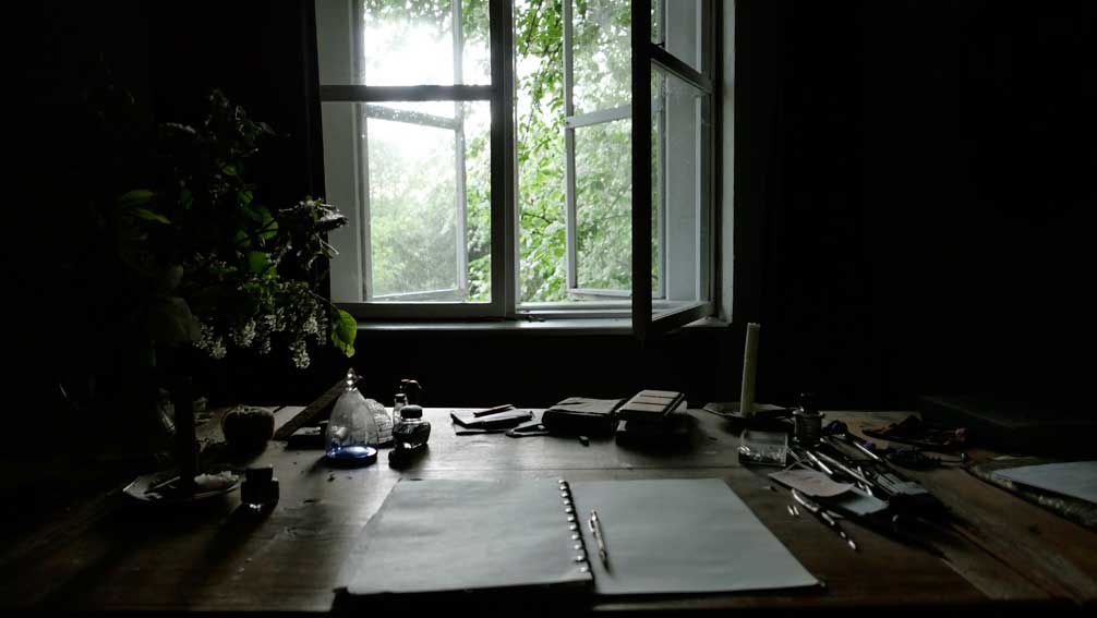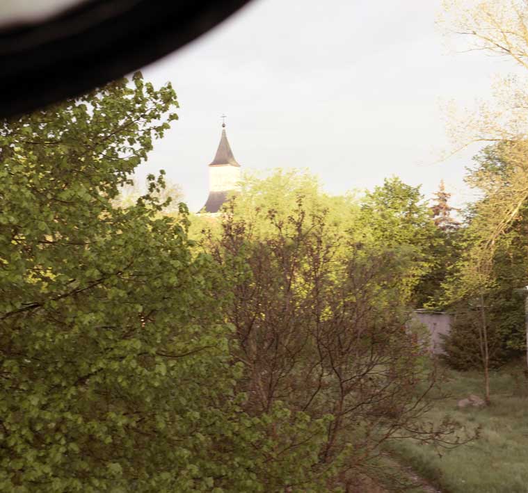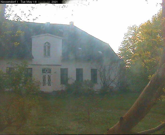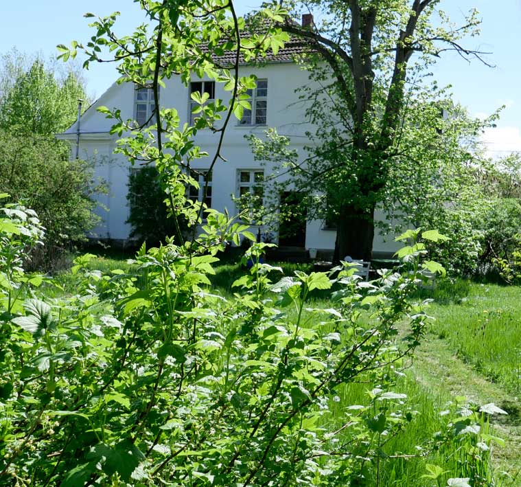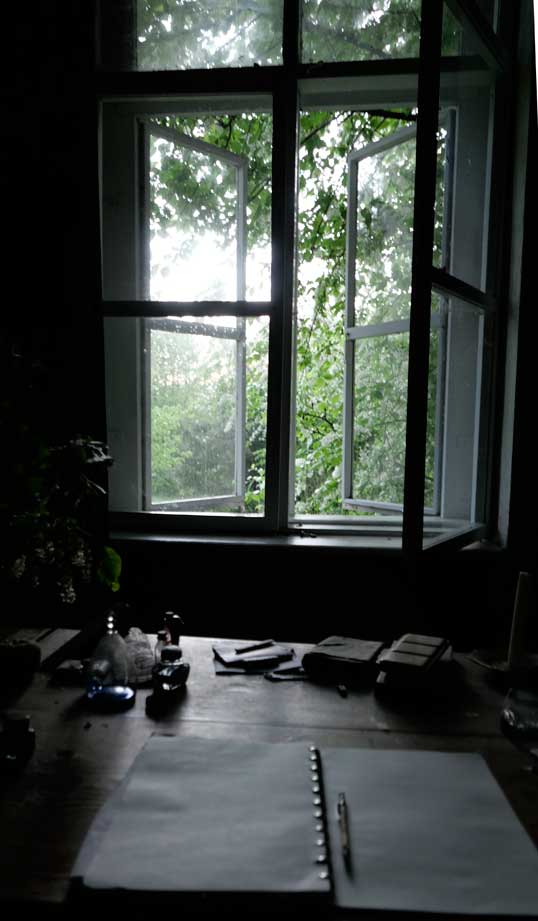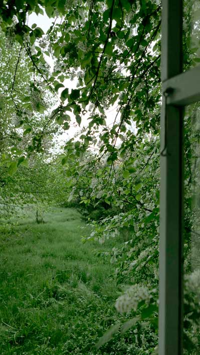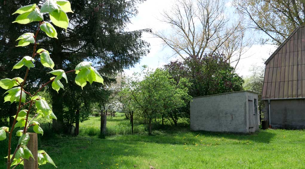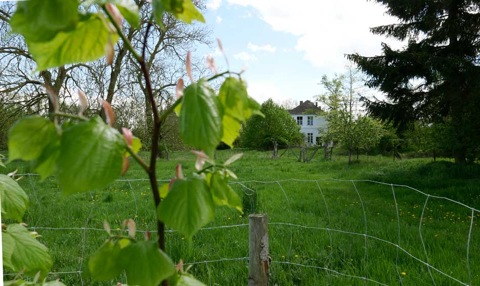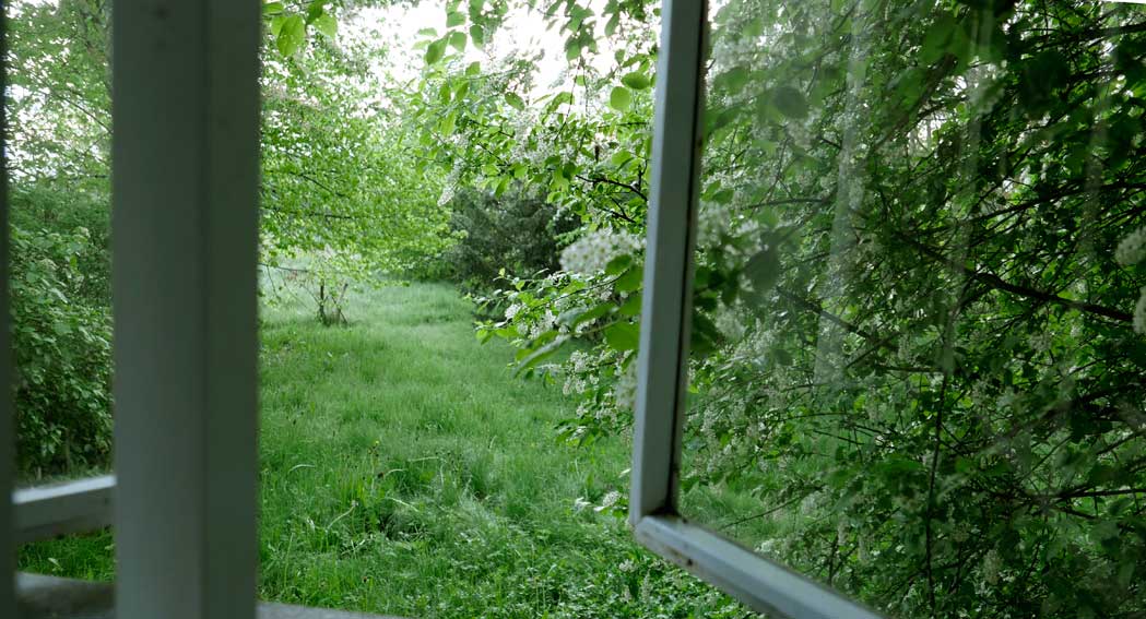 Fenster offen, der Kuckuck ruft, die Rehe am Rande der Felder über die Brücke des Grabens dahinten hinter dem Zaun.