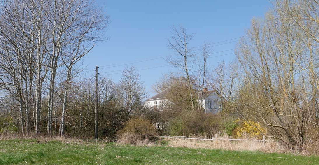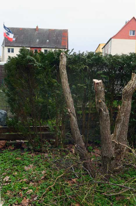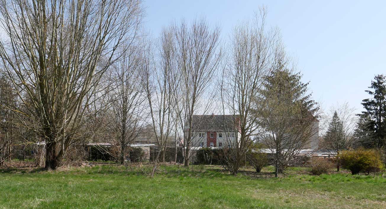Die Anlage sind im Frühjahr durchsichtig, vorne Grün der Beon wieder, danach die Bäume, die sie nicht wollen, und dahinter die Garagen mit den Garten . Das alles statt des ehemaligen Graben