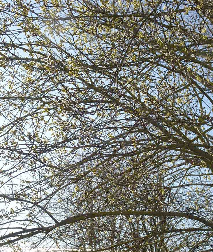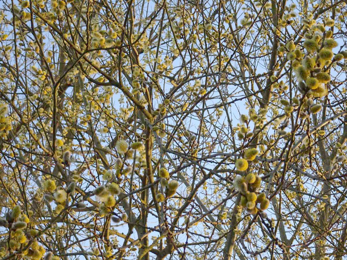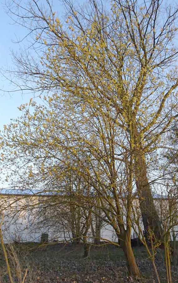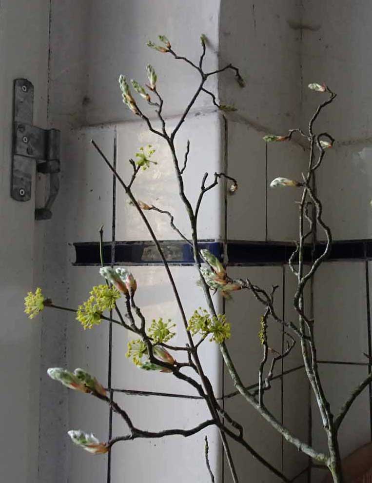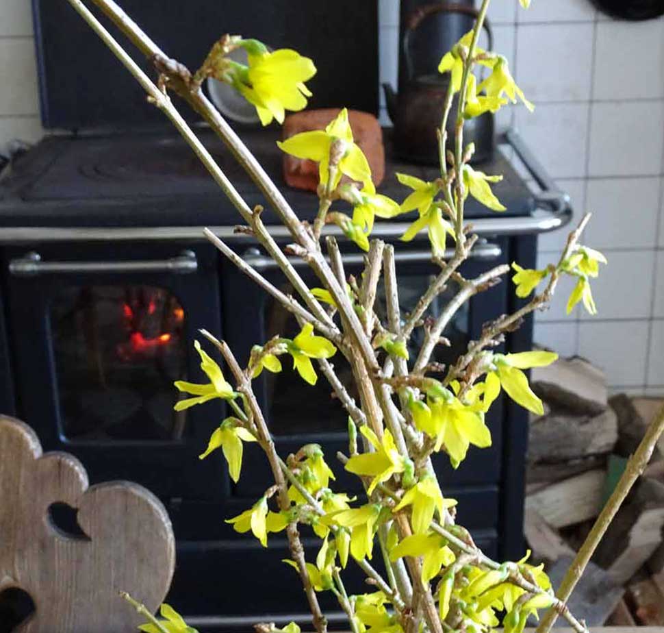 In der Küche mit dem Feuer des Herdes nachts die Wärmem von aussen auffüllend, lange wartend jetzt aufgegangen Hartriegel und Forsythgienb zusammen und demnächst auch die Felseenbirne