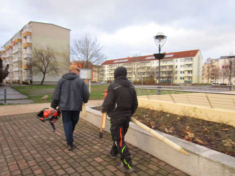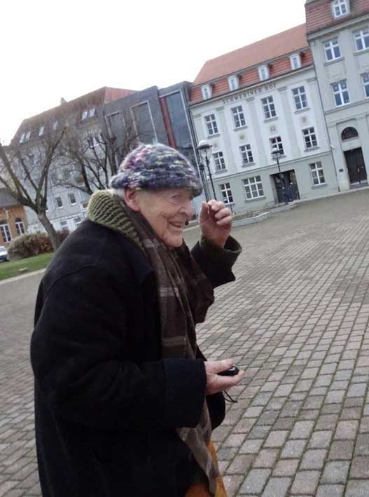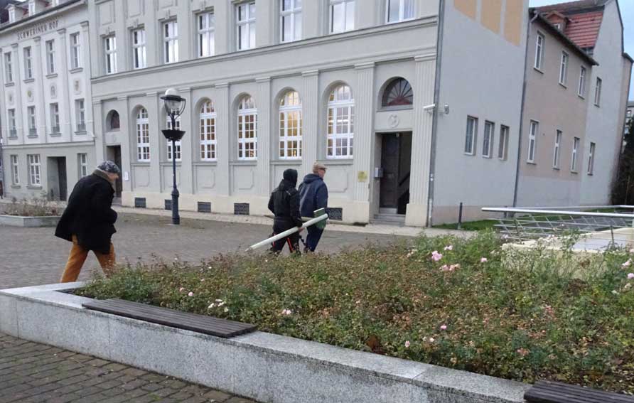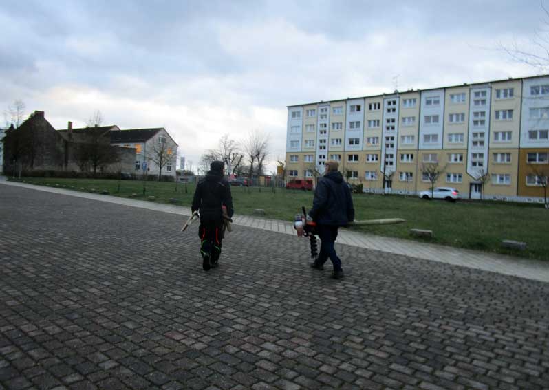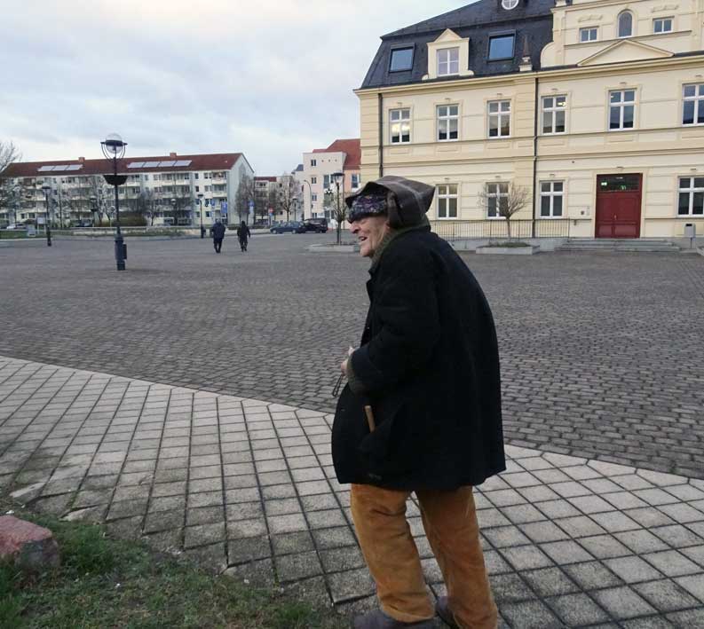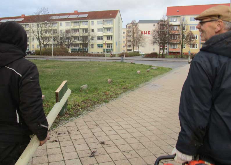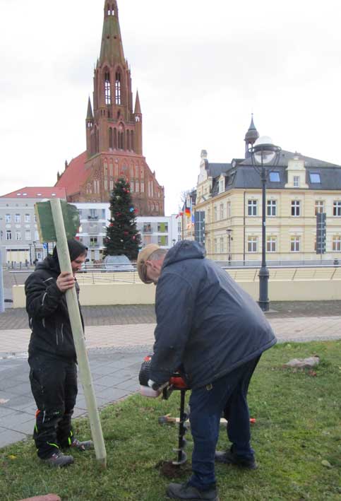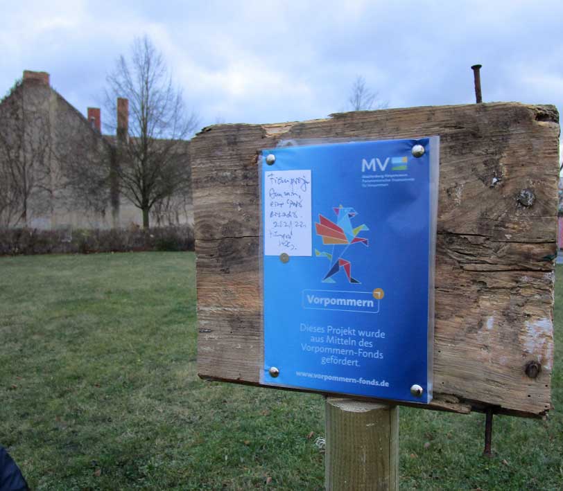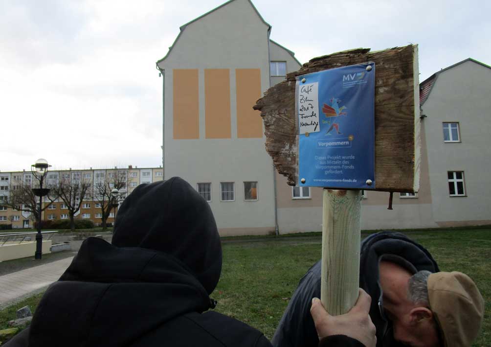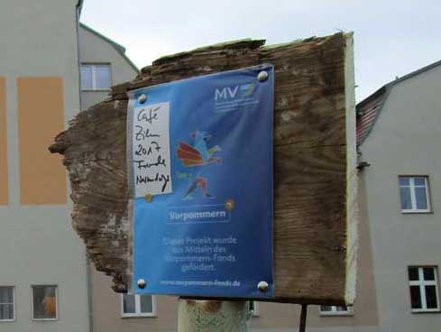 Und schon der Gang zum ersten Schild zeigt, wo wir sind, und was da nötig ist. In Anklam alles abgerissen.