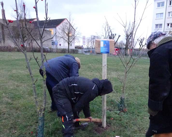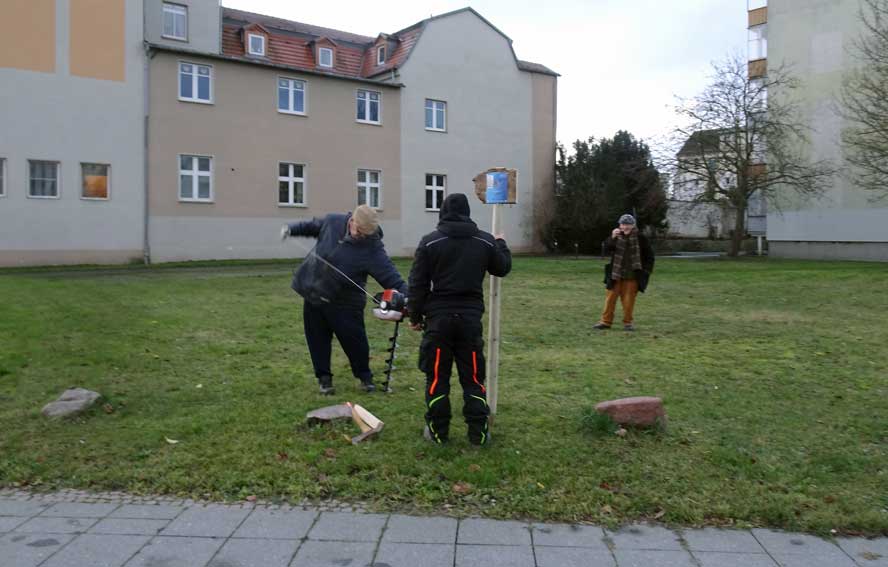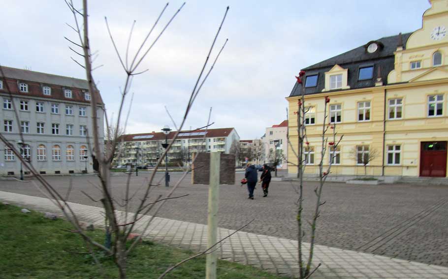 Und hier der Gang zum zweiten Schild an der offenen Südseite des Platzes mit der leeren Fläche abgerissener Häuser seit 76 Jahren