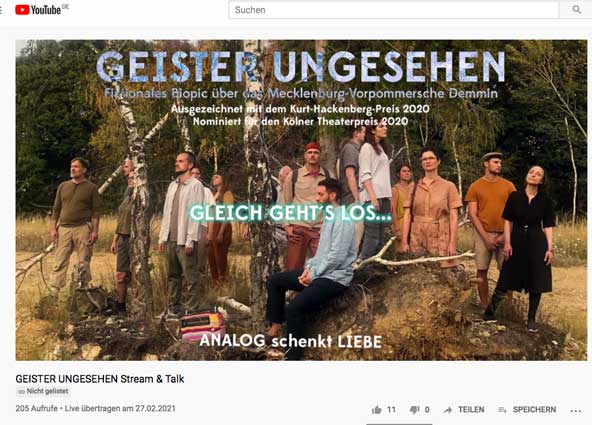 Am Sonnabend ein Theater-Film für Demmin aus Köln. Immerhin. Demmin als Thema über die Grenzen der Region und als Ergänzung und Kontrast zur Dokumentation von Farkas von 2017 der nächste offizielle Film zu Demmin 45 - und nichts in der Demminer Zeitung ? die Lachnummer seit der Kater-Geschichte, in der deren Büroleiter diser Lokalzeitung erklärt, ja diktierte Schluss jetzt mit den Geistern dieser Geschichte, der Toten. Das Intelligenzblatt der Stadt macht die Geschichte. Wielange noch. Dabei hätte man vieles auch bemängeln können, wo bleibt die Kritik an der Diskussion danach vielleicht als der Zeitungen erstes Gebot, empfängt man so die Gäste.Der Nordkurier in der Hand von Meinungsmachern? Theater in Demmin ohne das Blatt des Ortes?