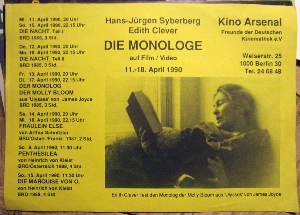 Diese Flyer zu Aufführungen in Theatern und Kinos, in Paris, Berlin Salzburg, markieren den Weg der Monologe . Zuletzt in der Totenklage für G. Rühle noch mal ins Licht gerückt. In einem Umfeld nicht selbst geschaffen.