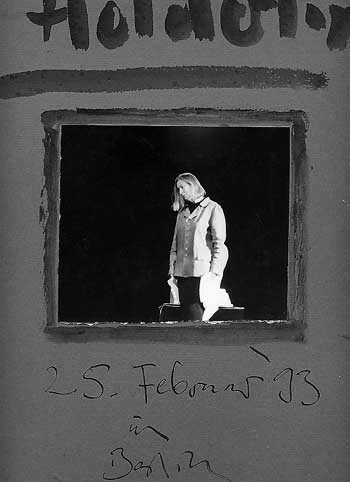 Wie kam es dann zu der Form, von wem und wenn es immer zwei waren, die eine da oben und der andere da unten, 4 Stunden, das Mass, wenn es fertig war, nicht erzählt, sondern seiend, als Gestalt. Total in der Weite der grössten Bühnen, und in Gross, das heisst ganz nah. Manchmal wusste sies selber nicht, ob und wie, aber am Ende immer sicher und wie auf schmalem Grat. Nur so. In sich. Fliegend und doch da.