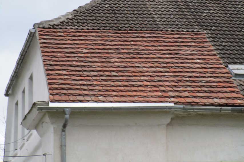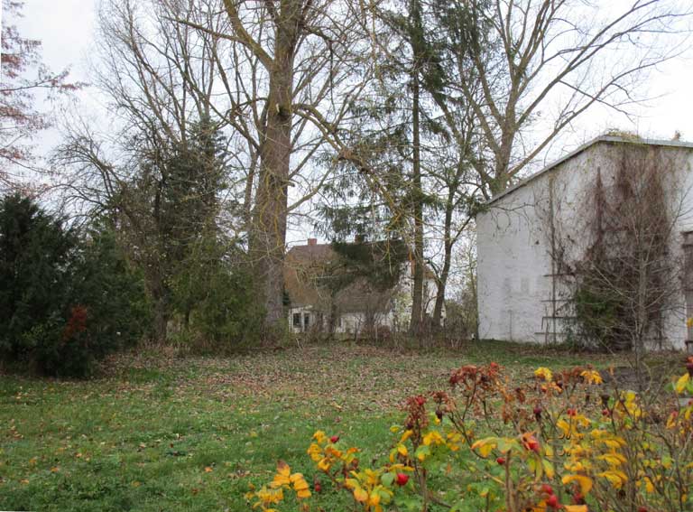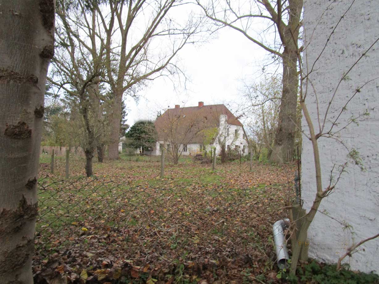 und auf der Hofseite der Scheune/Halle das Haus mit dem kleinen Garagentempel ganz rechts und der Biberschwanz Ecke des Daches ohne Linde nun auf der Küchenseite links