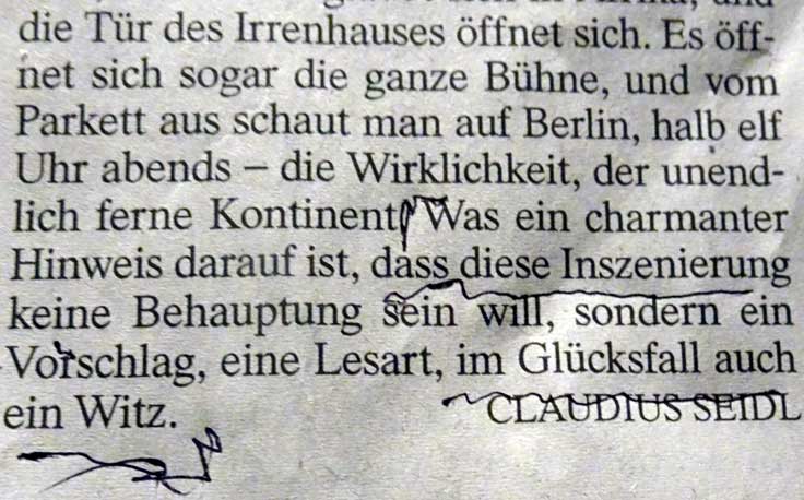 und noch etwas aus dem Briefkasten an der Strasse über den Hof nun im Haus unter gutem Dach. Aus unsereren Theatern. Was gelernt wenigstes da. Am Ende als Witz. Selbst.