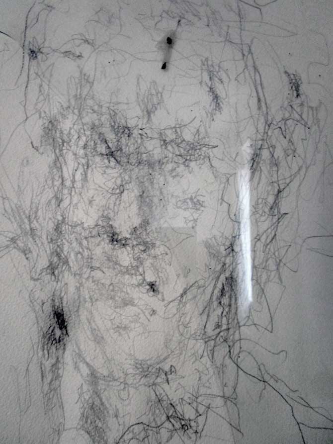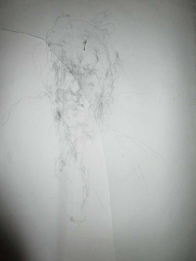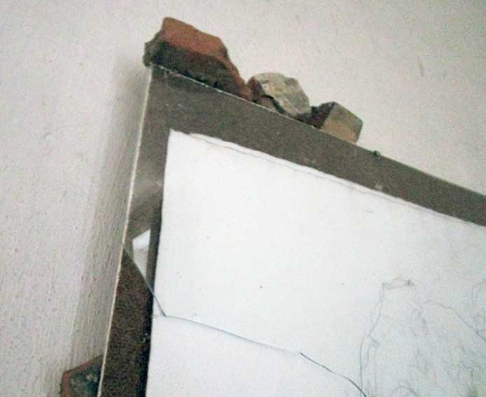 Ein zerstörtes Gesicht übergossen mit leid, aber gehalten von den Steinen wo das Glas gesprungen auch noch das Gleich Gewicht durcheinander brachte.