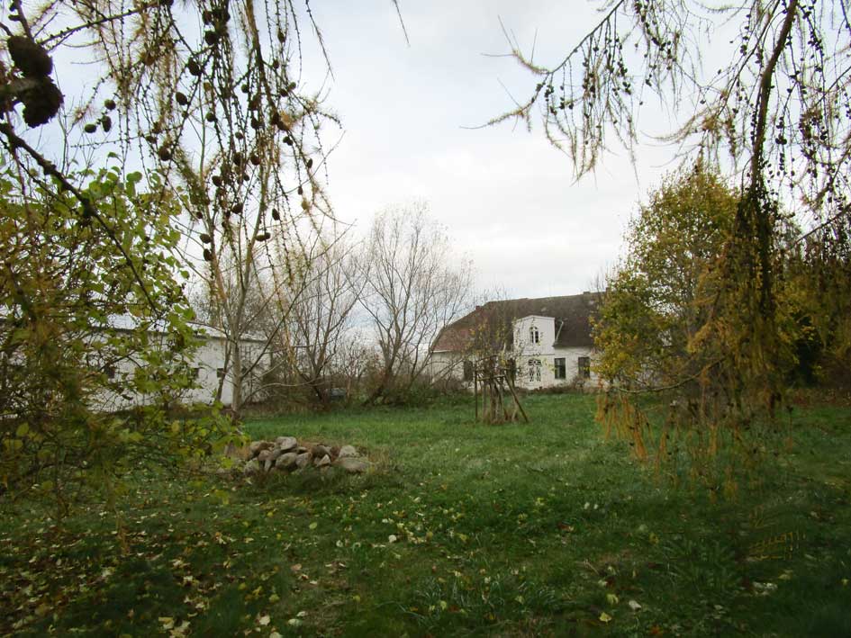 hinüber vom ehem. Kuhstall quer über den ehemaligen Hof der Blick an der ehem. Scheune vorbei zum nun auch wieder erwachten A-Haus