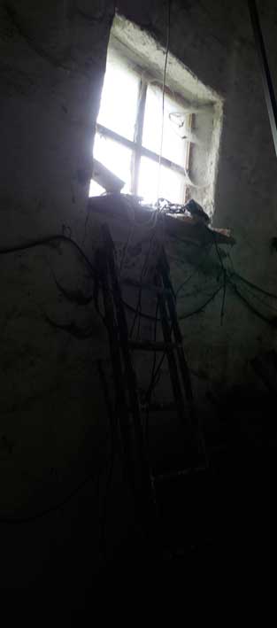 am Morgen das Haus nun so hinüber gehend mit Kamera in der Hand die Leiter hinauf das Bild zum machen des Hauses am Morgen
