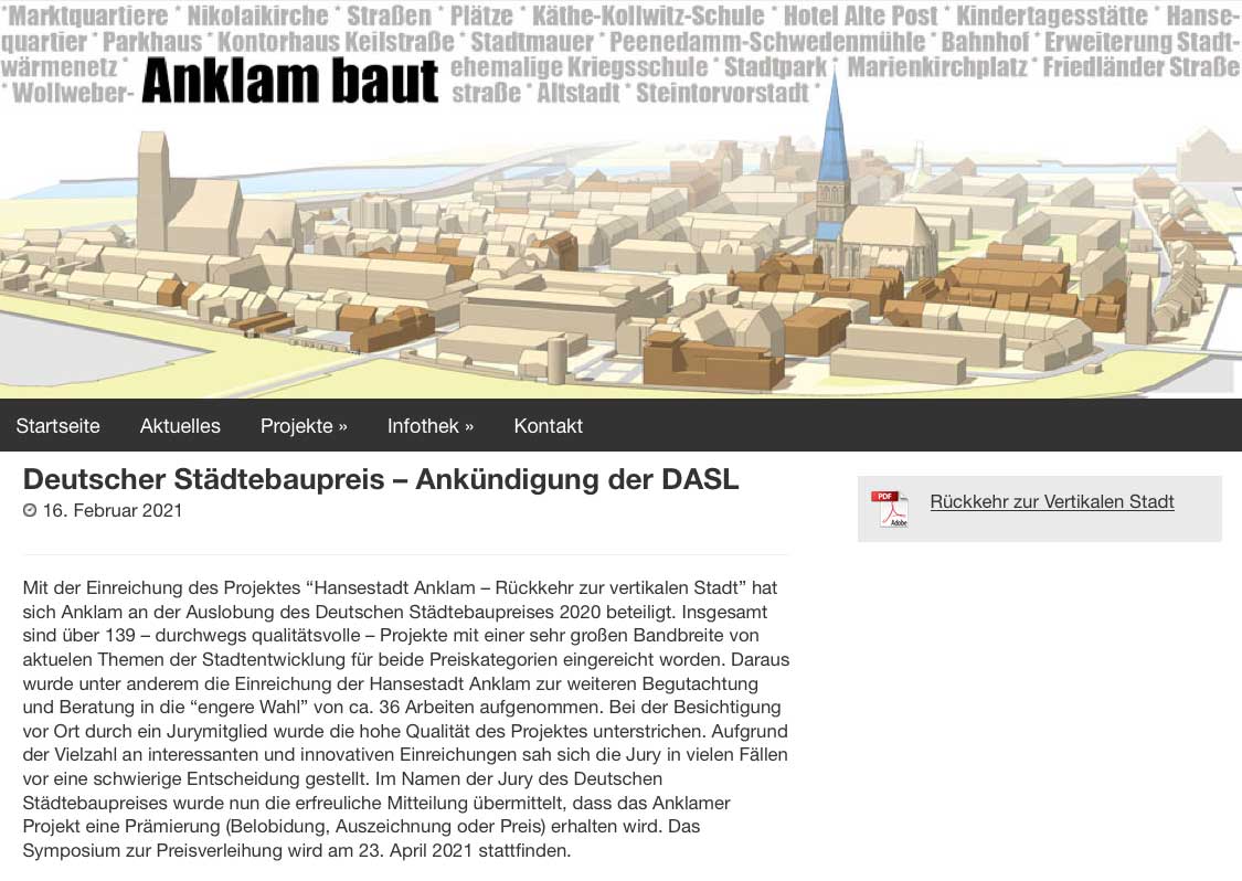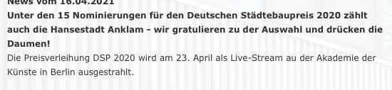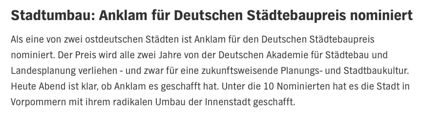 Heute wurde Anklam, die Schwesterstadt an der Peene, auch 1945 schwer getroffen und in der DDR durch ungerechte Baumassnahmen benachteilgt, für seine Aktivitäten zum Wiedentstehen der Stadt in den letzten Jahren hoch belobigt unter vielen Bewerbern aus Deutschland in Ost und West. Und macht es vor, wie das geht.
