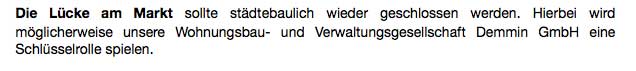 Th. Witkowski. Er hat sich zur Wiederherstellung des zentralen Marktes der Stadt bekannt. Und er weiss, ohne Anziehungskraft des Ortes wird es nicht gehen, solange nicht die Davongegangen zurückkommen und Neue hereinschauen. Wie das, nach Hanse-Zeit und Ulanenresidenz. Demmin, die Stadt der Toten. Macht was draus. Aber so, dass alle es annehmen können. Kultivieren wir die Trauer und Geschichte.