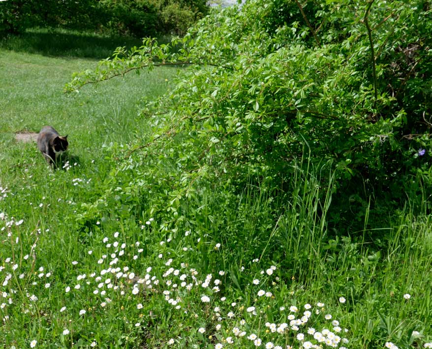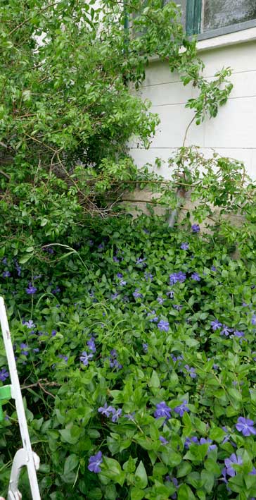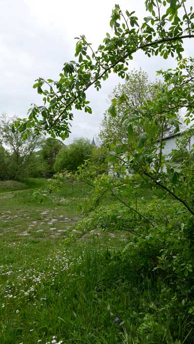 Der Baum an der Mauer des Eingangs aber fehlt, die Esche vor einm Jahr gefällt, und so die neuen Triebe nach oben.