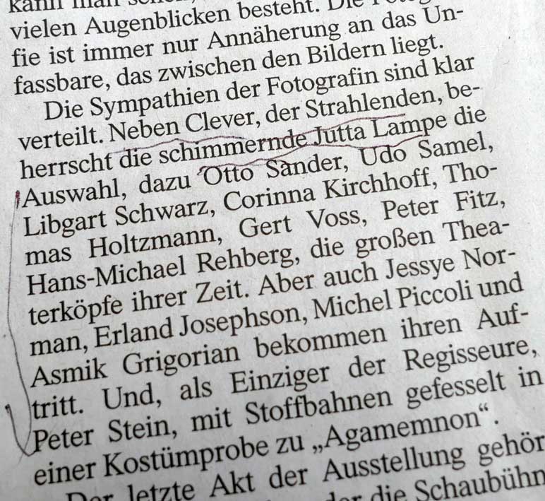 glaube 3 mal oder mehr Edith Clever vor der Kamera von R.W. zitiert aus der Schaubühne. Und da hatte sie ihre Meisterschaft ungeteilt. Aber die EC. bei uns sie nie. Also sind wir dd nun raus aus den aktuellen Archiven der Redaktionen. Aber warum nur bei uns und warum und wie -das ist eine andere Geschichte der Fotografie und desTheaters dann. Für eine Extra - Installation. Selbst. Des Authentischen, wie sonst nie und