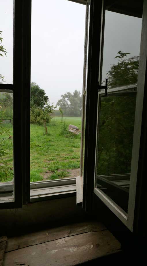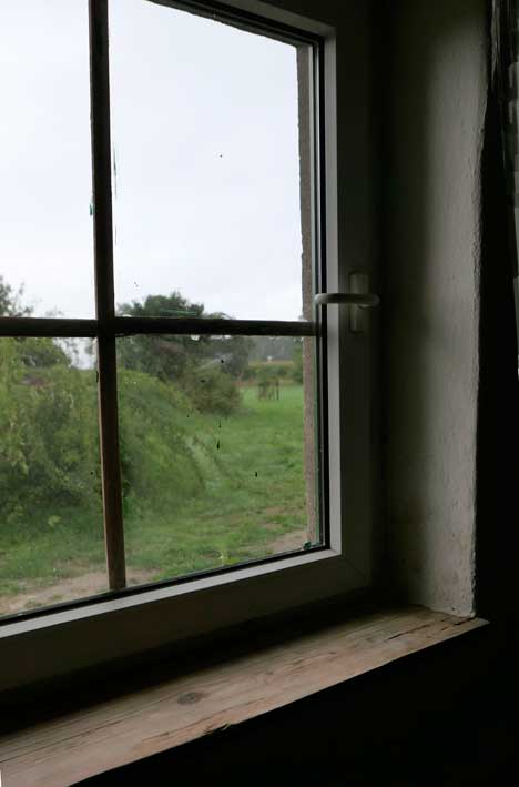 Die alten Fenster ohne Fensterbrett, weil da die Bank steht für den Tisch davor.
