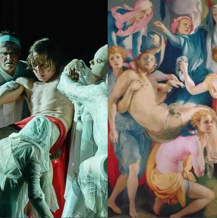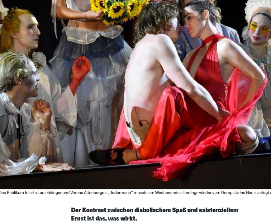 Das Wirken auf der Bühne vor dem Dom in Salzburg ist Theater. Und das Schlussblid mit der Ikone christlicher Aussage einer Er-Lösung des Menschen als Gottes-Sohn in der Armen der Mutter als Tod ist nur erlaubt in der Trans-Formation der Menschheits-Erlösung nach dem Gang aus der Banalität des zuvor vorgestellten Lebens dort ins Innere dieses Doms an diesem Platz. Dieser Tod, in den Arnen dieser Frau braucht viel Wissen. Ganz anderer Transformationen. Um das so bauen zu können. Auf Instagram kommt es zurück in die Banalität des hinter die Barrieren des erlösenden Theaterlebens . Vorsicht.