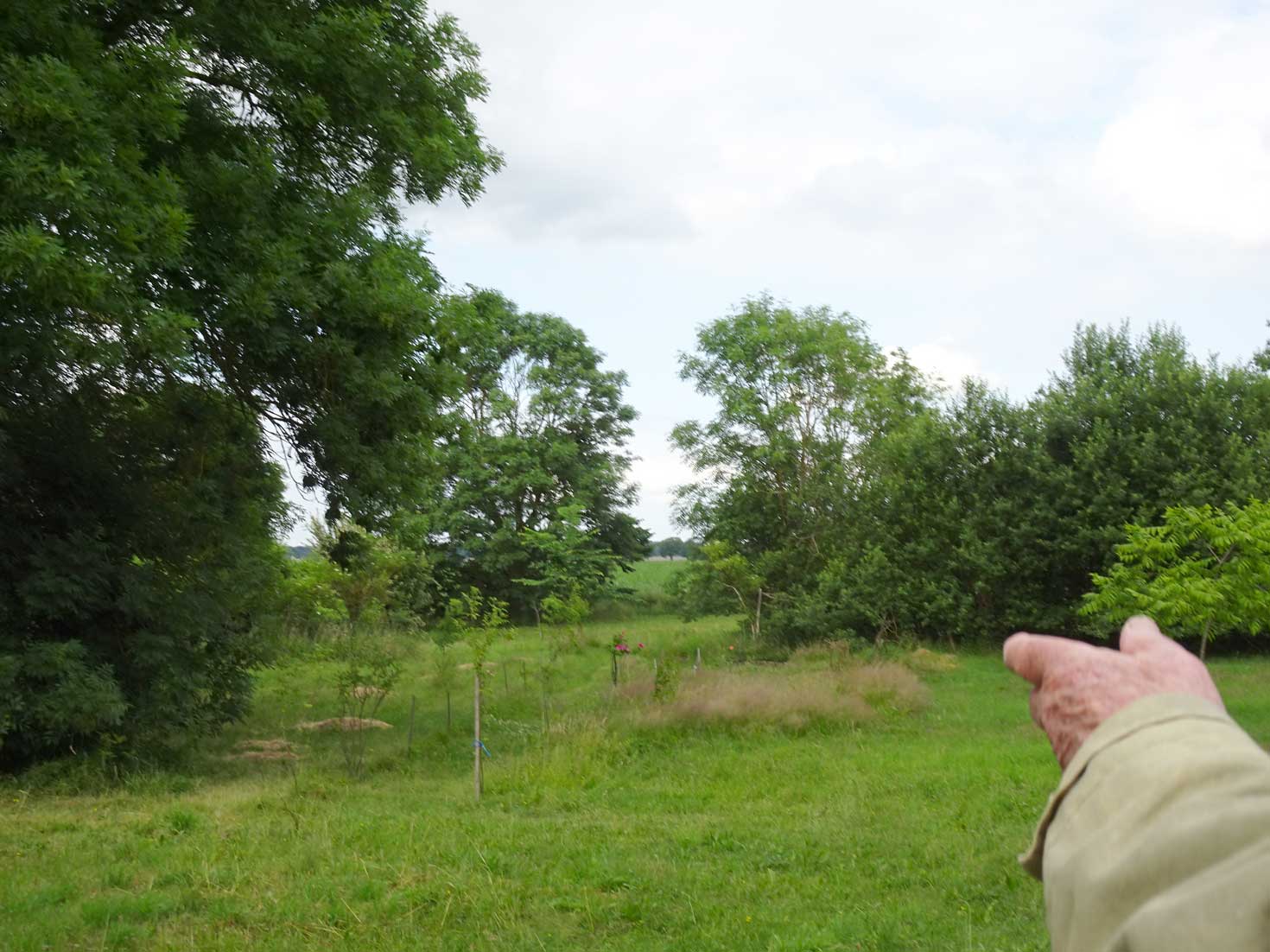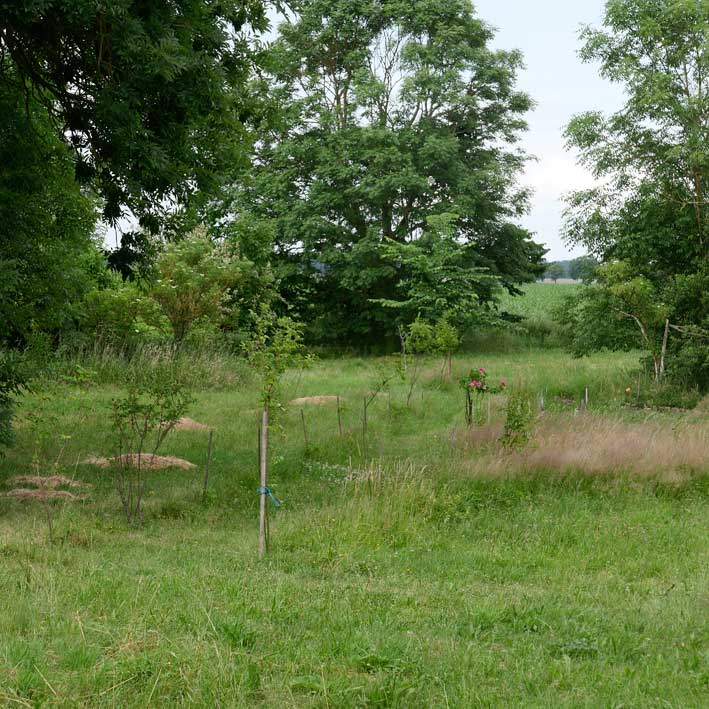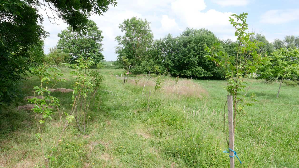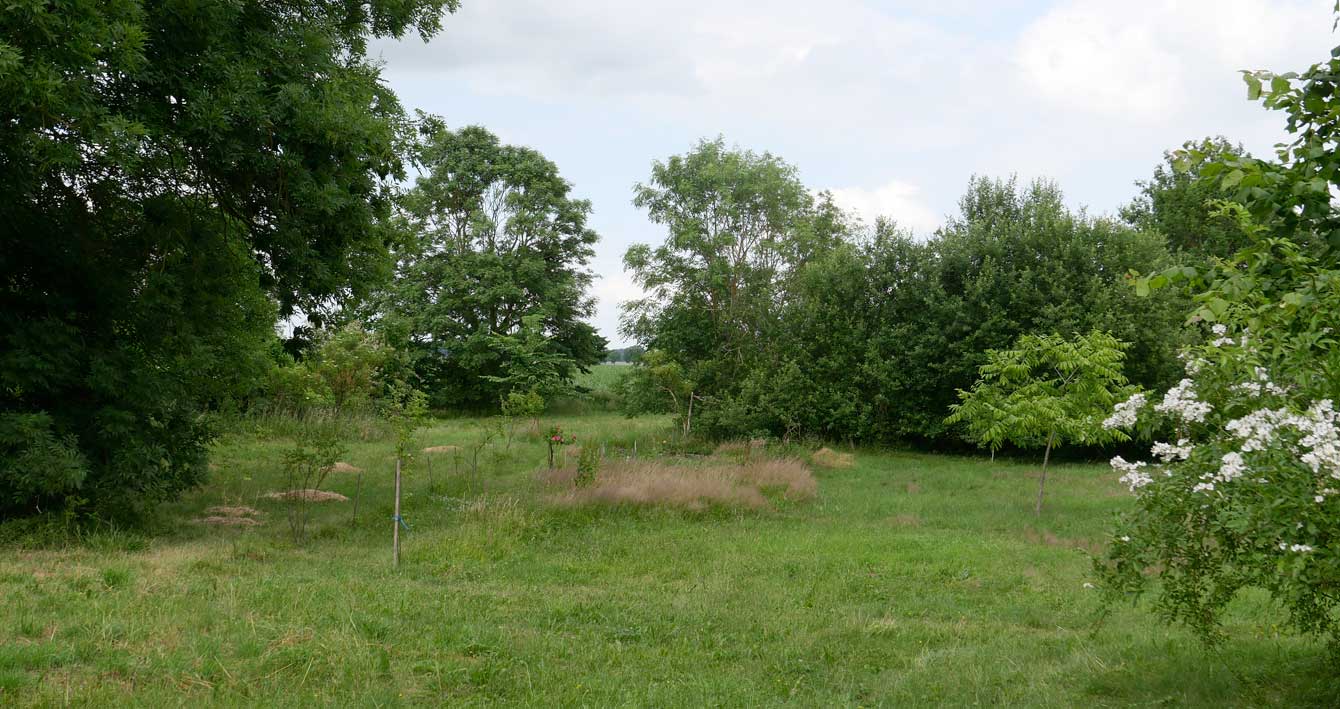 Der neue Rosenweg zum Spargel mit dem von der Mahd stehengebliebenen Biotop der Wiese, dahinter das Feld , die Chaussee und der Wald.