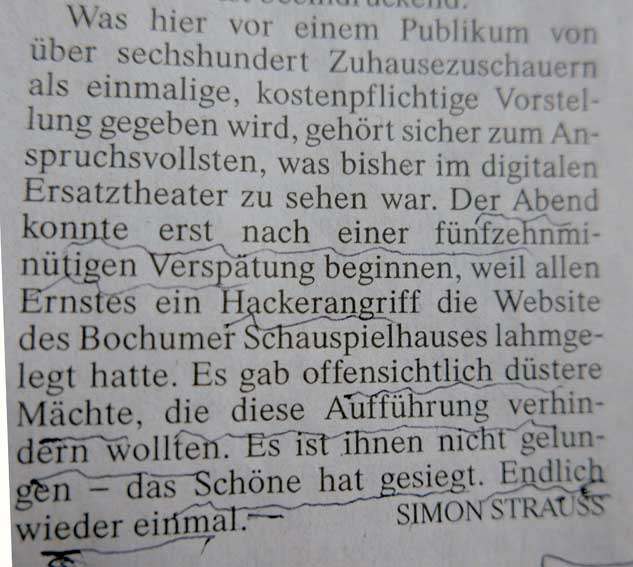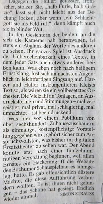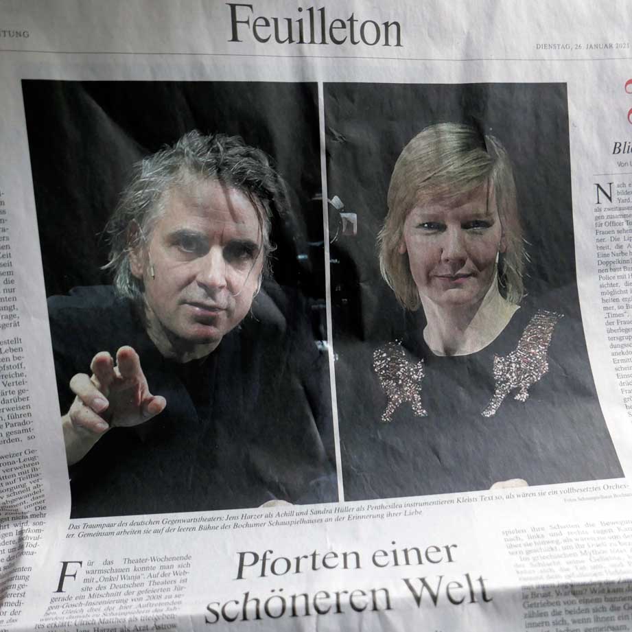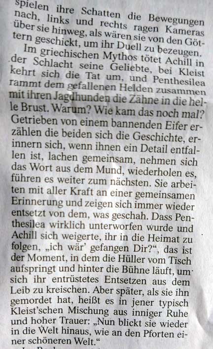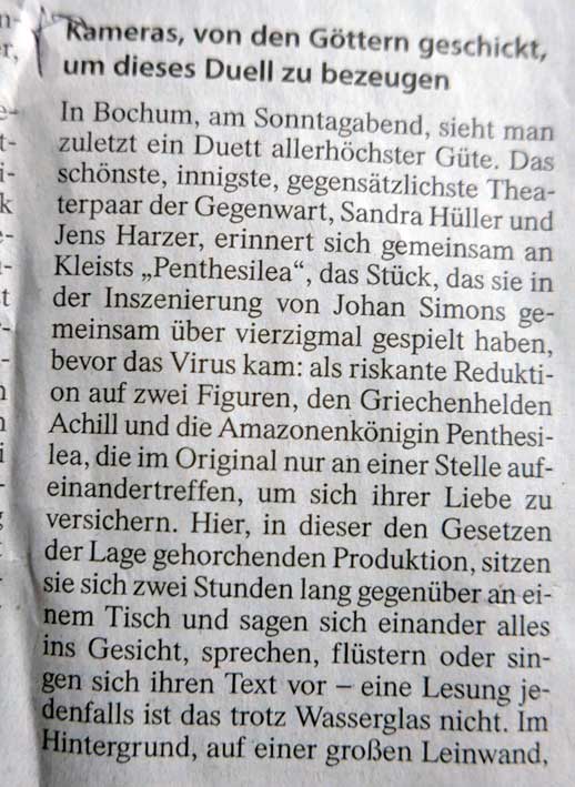 In der FAZ nun zum wiederholten Mal ein Jubelsturm auf eine Aufführung der Penthesilea, Kleists grosses Sprachwerk, das auf Theatern aufzuführen eigentlich immer an der Realität dieser Worthöhe blieb. Und das in unserer Zeit der Theaterferne besonders.