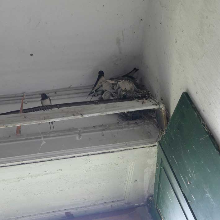 die Nest-Schwalben über uns sind nun ausgeflogen. Der Entzug der Nahrung macht sie flügge. Jetzt müssen sie raus. Die Grossen machen es vor, begleitend, im Kreis an der Decke des Raums wie es geht das Fliegen, mit erregten Lauten, und dann hinaus, Fenster, Glas, vorsicht, und Katze. Warum sie diesen Ort gewählt, so schwierig auch mit uns, der Abwurf des Kots aus dem Nest diesmal aufmerksam und rücksichtsvoll sehr gering, man kann im ersten Abflug auf den Vorhanganlagen entlang der Wand am Anfang immer wieder rasten.