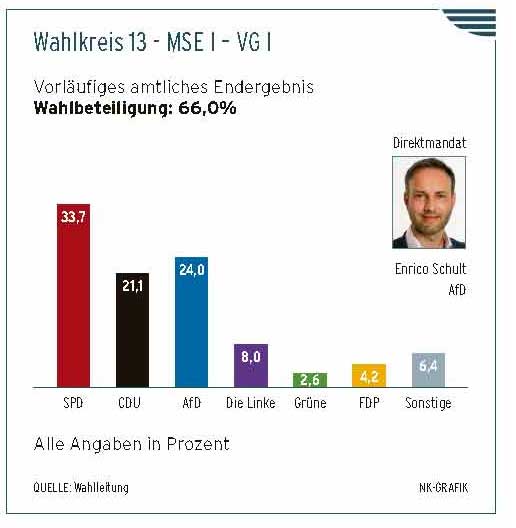 Das einzige AfD-Direktmandat in MV geht an Enrico Schult vor Franz Robert Liskow (CDU, der 100 000 für das Haus Demmin brachte und das Geld für die Feuerw. in N. und der zur Orgelweinweihung kam, immerhin)