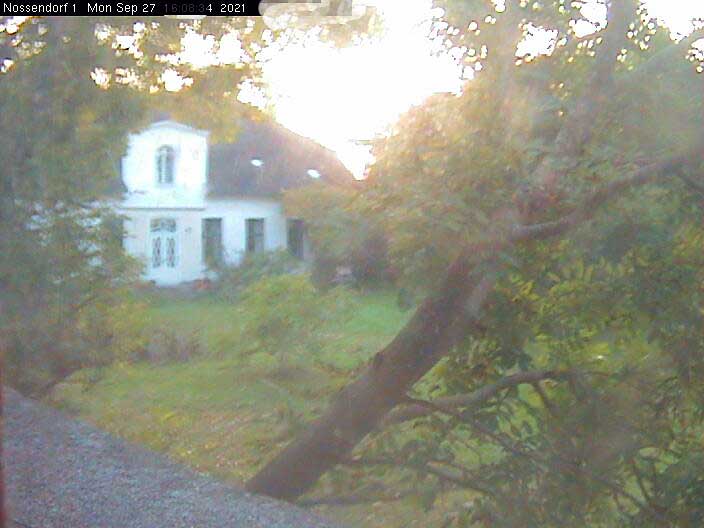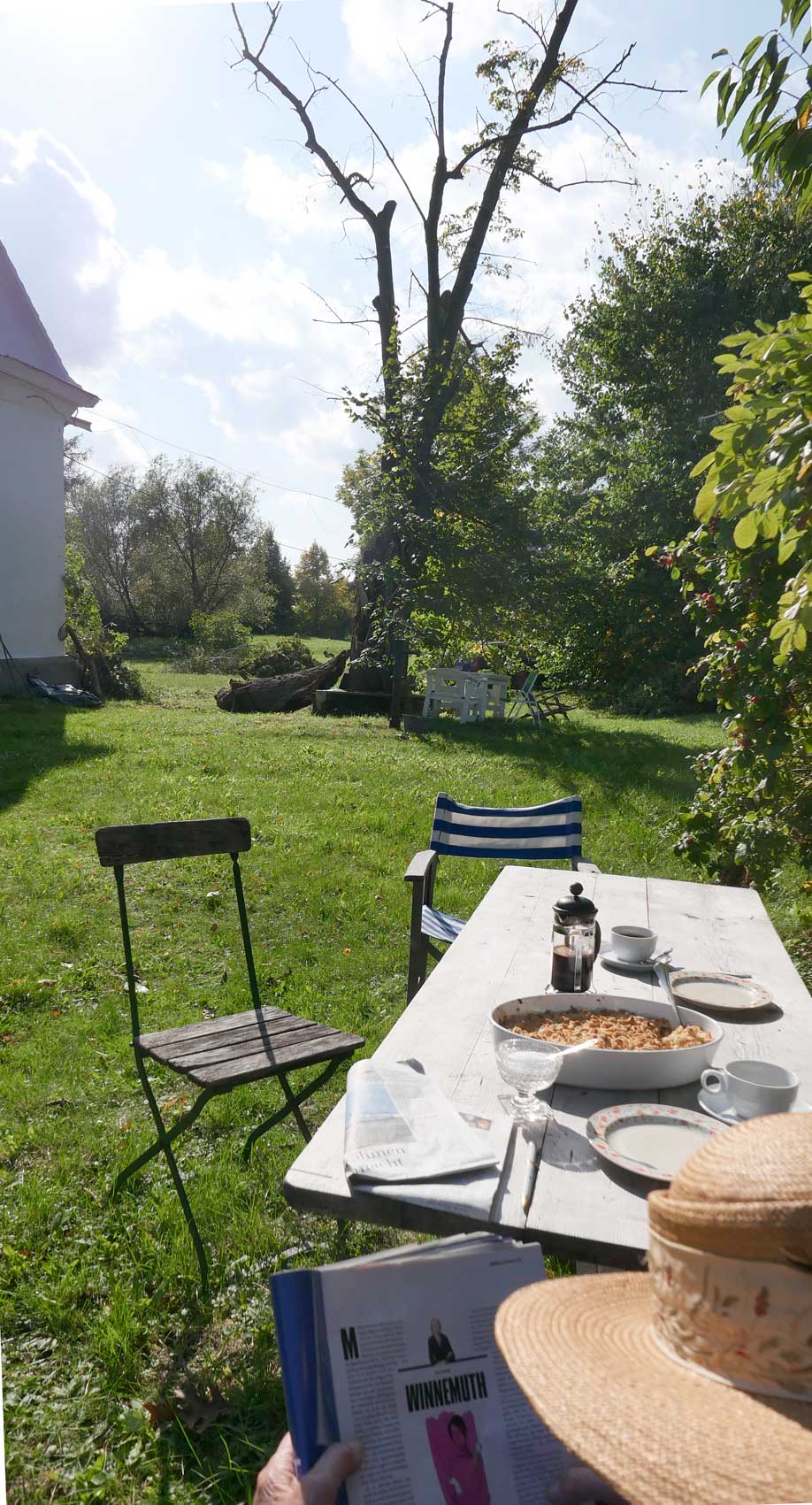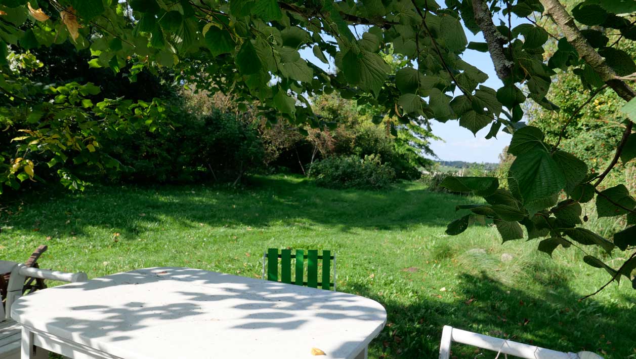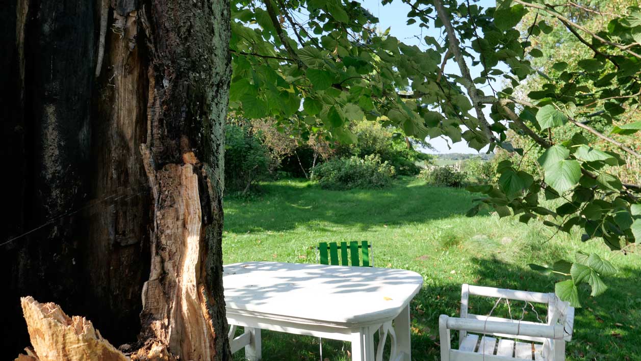 Neben dem grossen Loch als Stamm die Bank und mit Tisch und Stühlen unter dem Dach der Zweige als ob nichts gewesen wäre, weithin bis zum Wald über die Felder und Koppeln der Blick. Zum Graben von 1945.