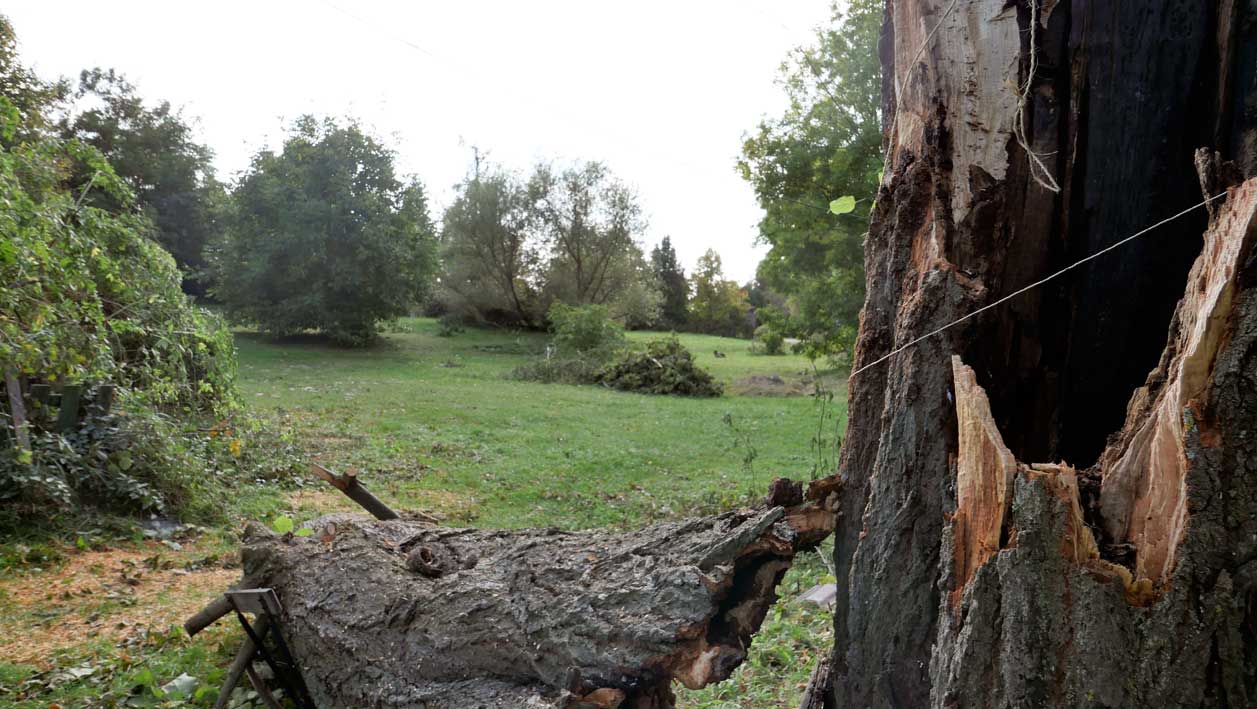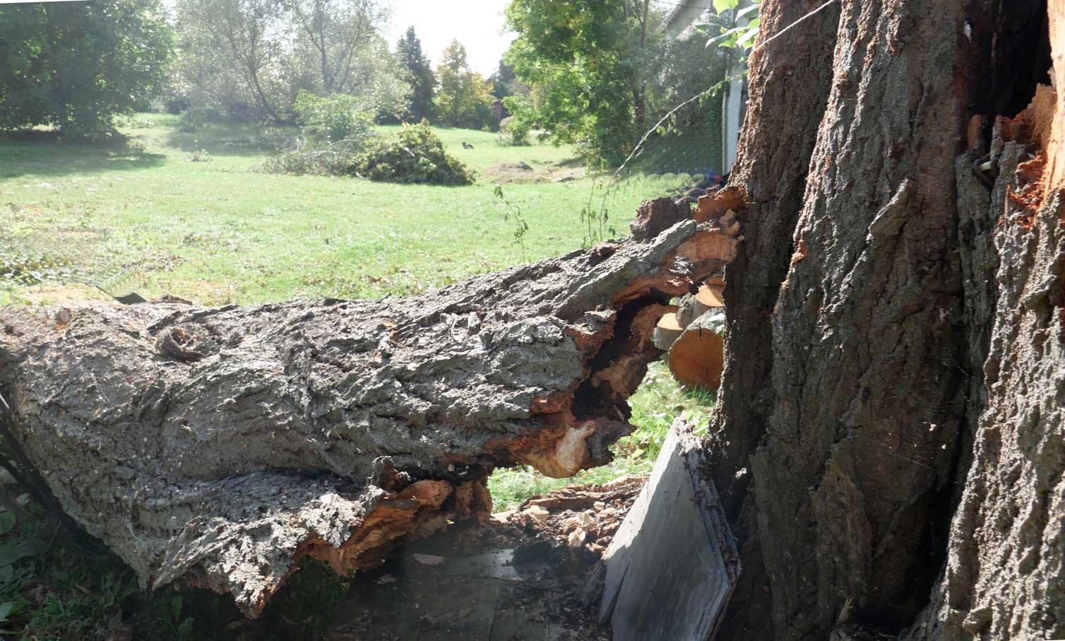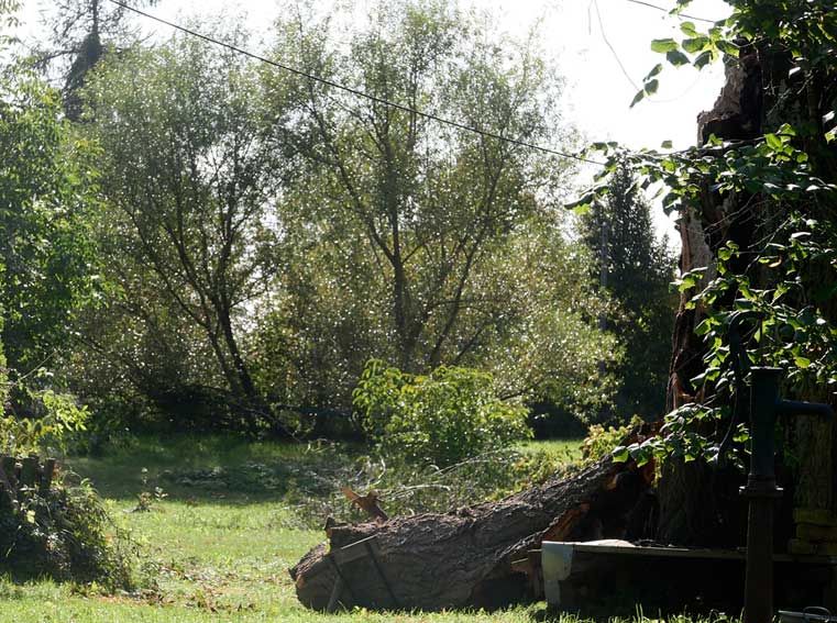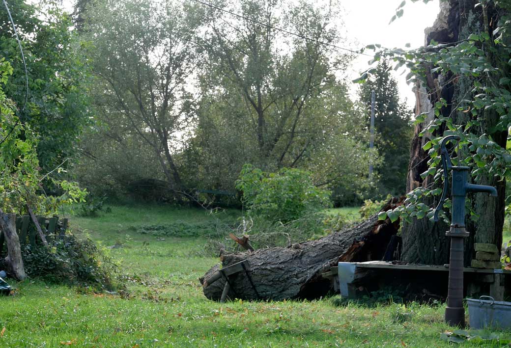 schwer liegt nun der Korpus des halben Baums vor uns. Die zwei betroffenen Bäume ihres angezählten Verschwindens einander gegenüber. Die Weide fiel in der Mitte des Hofs . Durch Eisenteile in die Wurzeln gerammt.