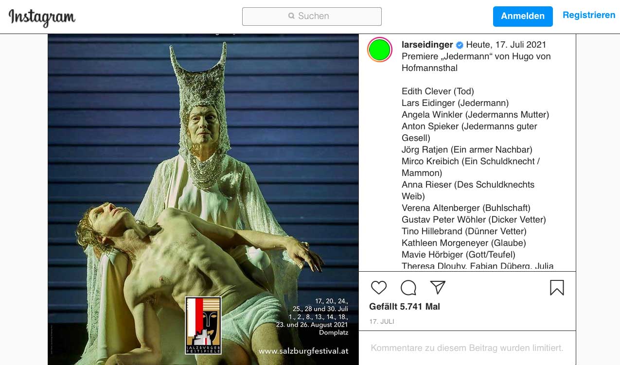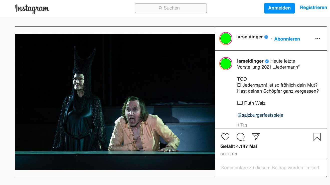 in Salzburg dem Babylon unserer Zeit geht das Grosse Welt-Theater dieses Jahres zuende-nun mit dem Text in der Darstellung der Titelfugur auf Instagram plus Tod der alten Frau. An der Stelle des Buhlschafts-Getümmels sonst.