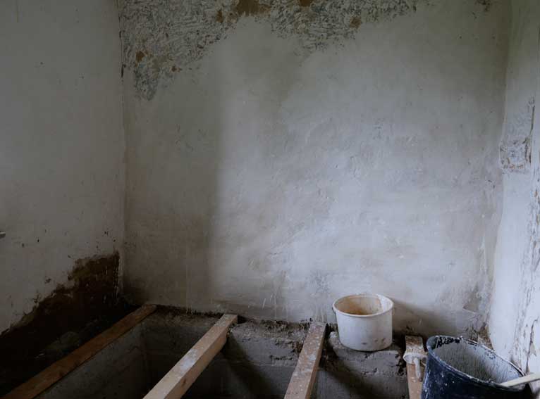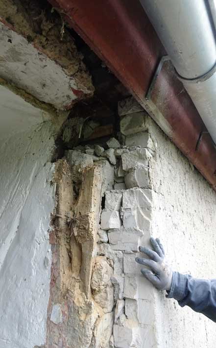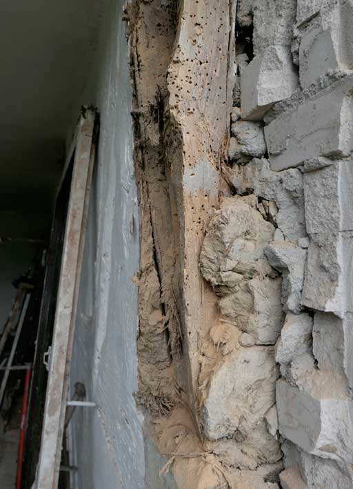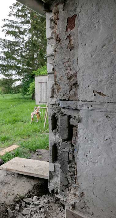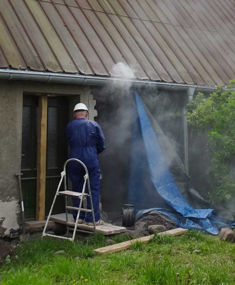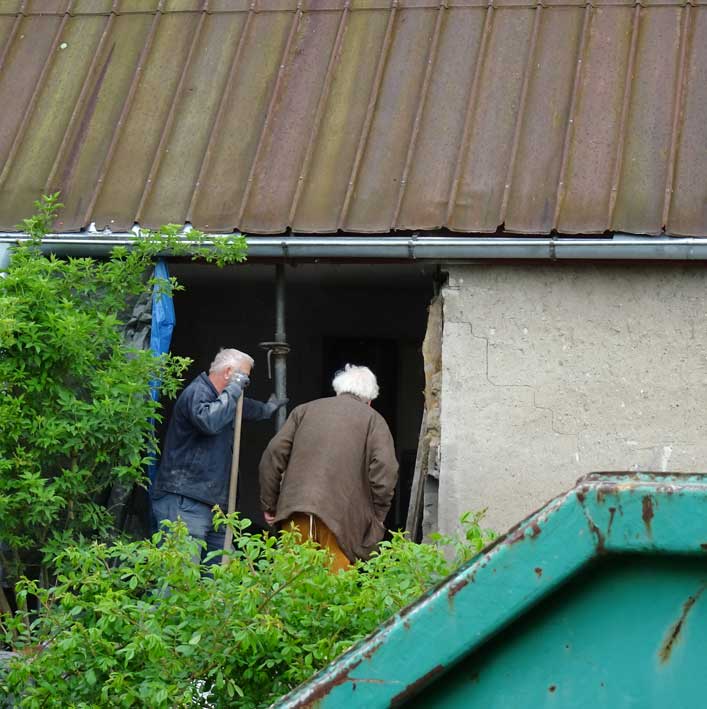 arbeitend an neuen Mauern und Türen oder Fenstern aus altem Bestand