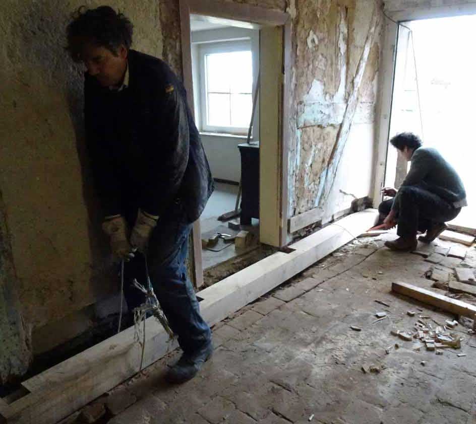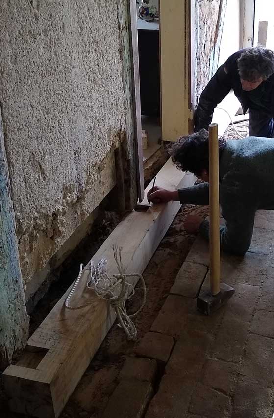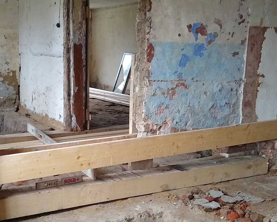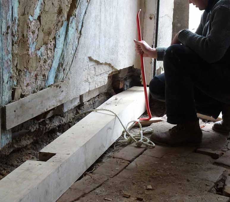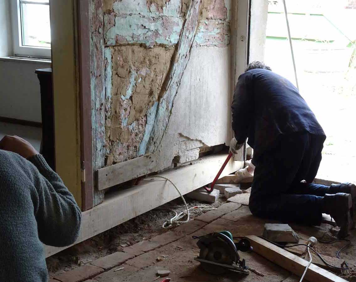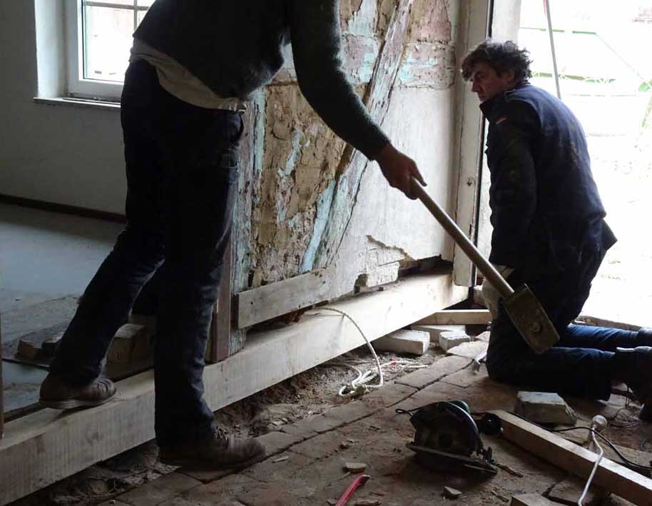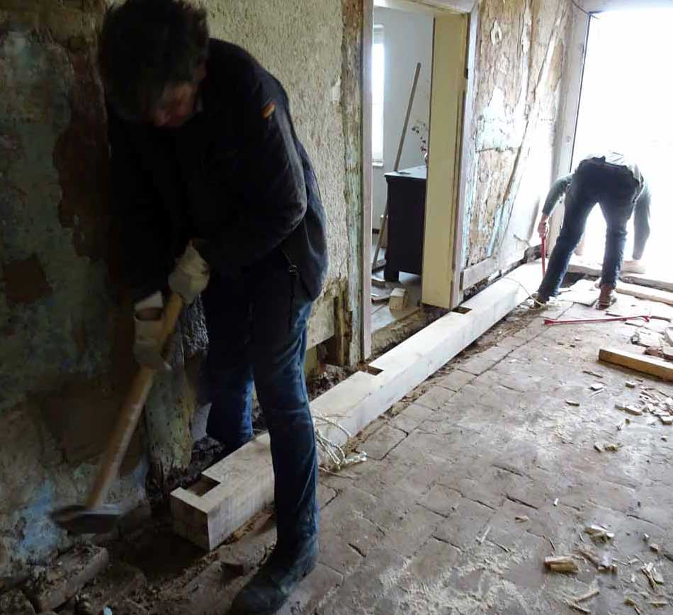 Die alten morschen Balken sind raus, nun kommen die neuen herein, Von unten, unter die Mauer geschoben