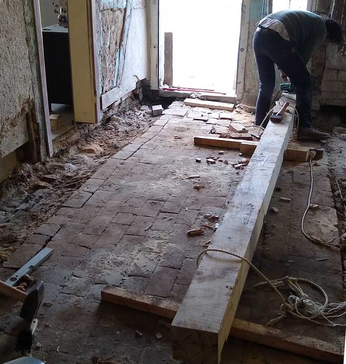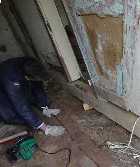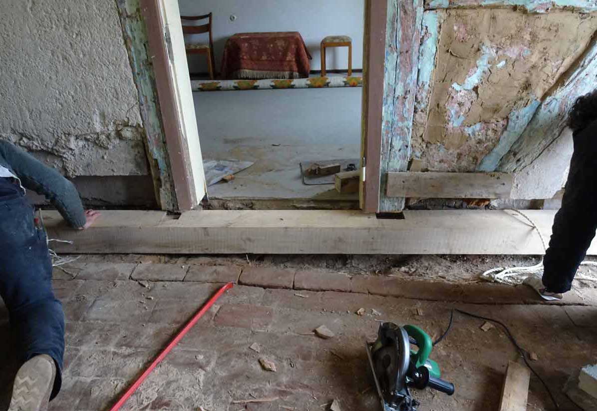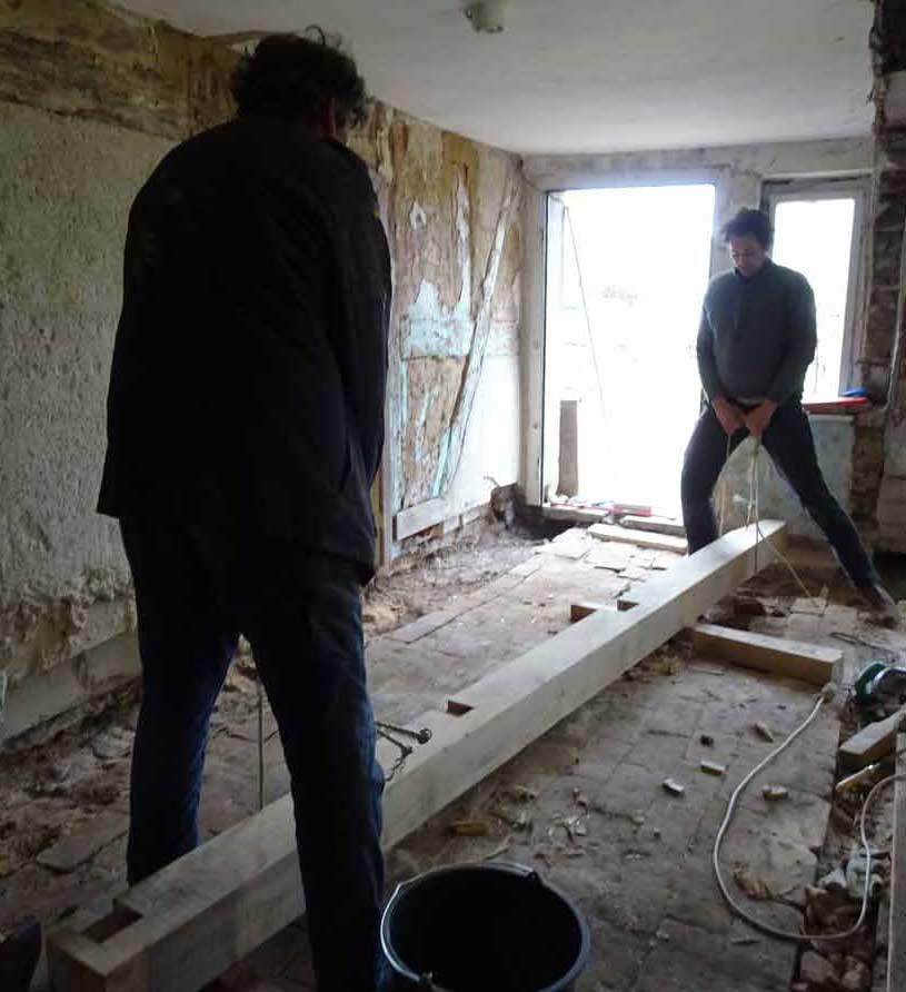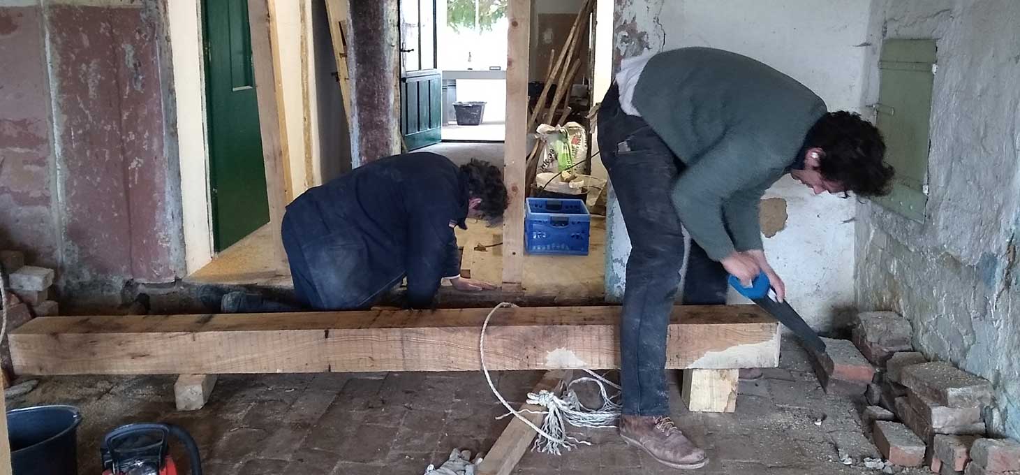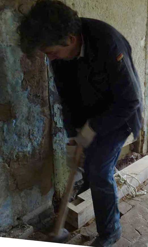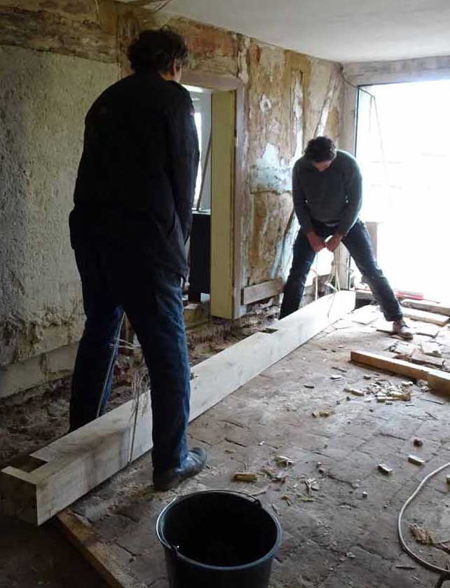 Die alten morschen Balken sind raus, nun kommen die neuen herein, Von unten, unter die Mauer geschoben