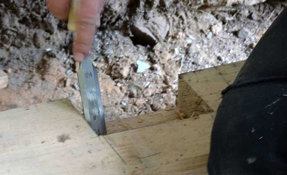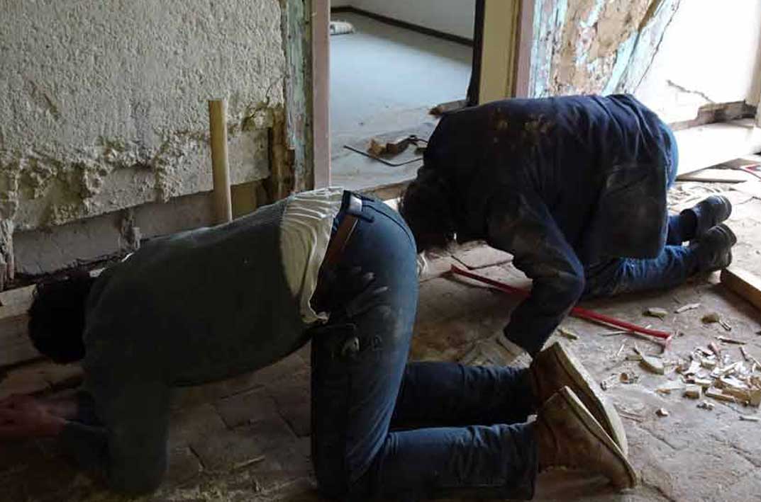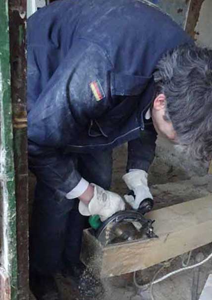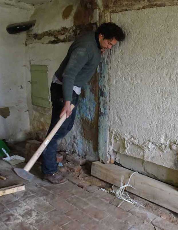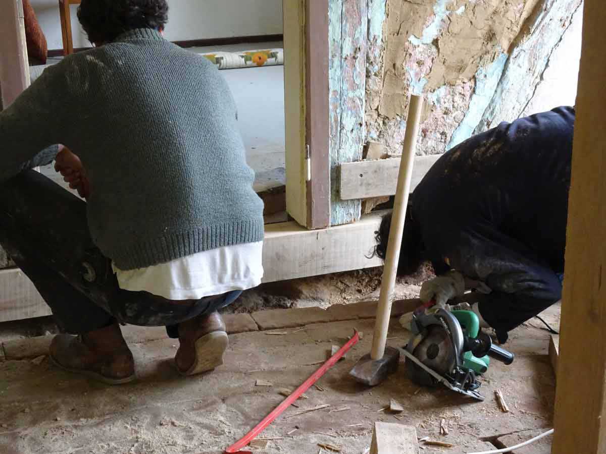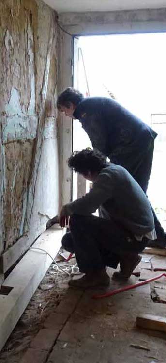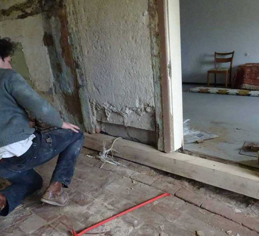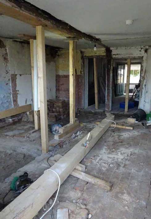Die alten morschen Balken sind raus, nun kommen die neuen herein, Von unten, unter die Mauer geschoben