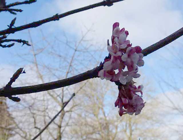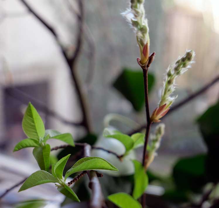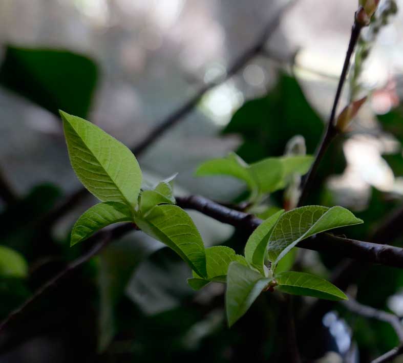 die Traubenkirsche mit frischen Blättern aus den wie toten Knospenstrünken, wie zum ersten Mal jedesmal