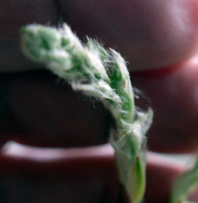 die Blütendolden der Felsenbirne in langsamer Geburt aus dem Gespinst des feinen Härchenpelzes