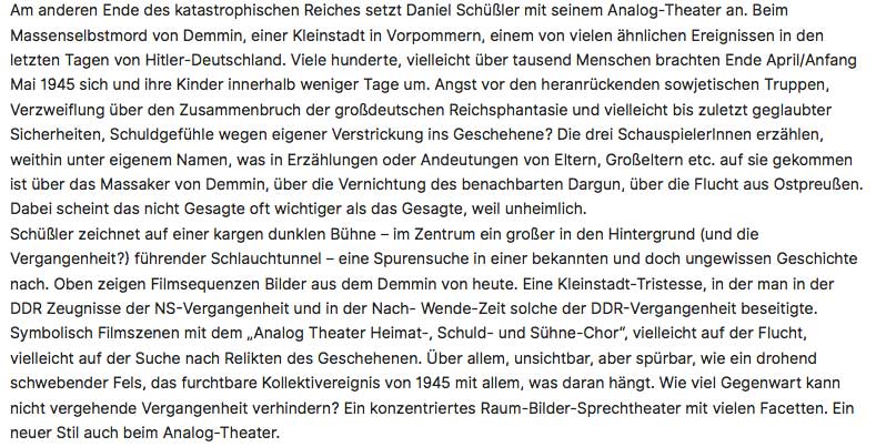 Das alles interessiert die neuen Funktionäre der Öffentlichkeits-Vermittlung nicht, nicht mal zu vermerken, was fehlte und vielleicht warum. Fehlend die einzig rettende Musik als der Stadt schönste Erhebung aus sich selbst, in der Kirche St. Bartholomaei und aus des Peene- Chors volkstümlicher Variante der Stimmen des Volks von hier. Alles fixiert -nochmal- auf den Untergang von und nach dem Todesstoss einer Stadt. Wenn auch auf alternativer Höhe. Und der Täter Trauma im Sinn hier in siegender Uniform der gewaltsamen Okkupation, die sie Befreiung feiern danach im Talk, mit den fehlenden Erynnien in Schwarz in langen Zügen schweigend durch die Stadt, mahnend was da noch ist, und gar nicht wie von dieser Welt, die sie wollen. Nichts davon als Kritik nicht mal das, aus, Ende des Lebens und als Totengräber eben diese. Bleiernder Deckel und aus? eben dieser. Und alles fremdbestimmt mit einem Dialog am Ende ohne Bewohner der ersten Stunde der Ortes. Und jede von heute im Dienst. Wie darf das sein ohne Kommentar eben von da , wenn Öffentlichkeit funktioniert.