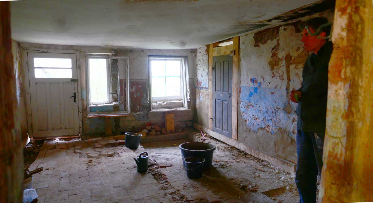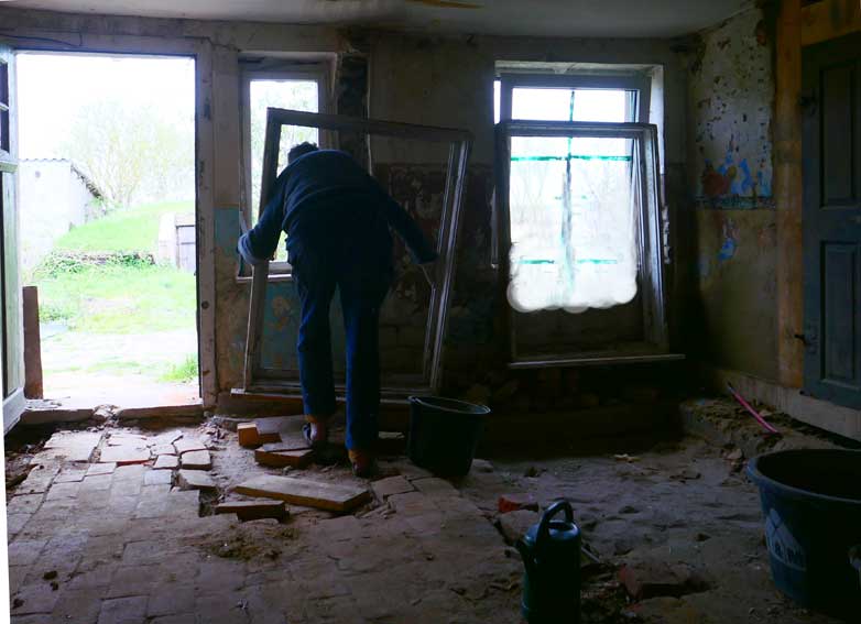 Neue Fenster. alte, werden bald uns freuen. Lehm und Holz an den Wänden, und Backstein am Boden, ein grosser Raum als Küche zu leben,