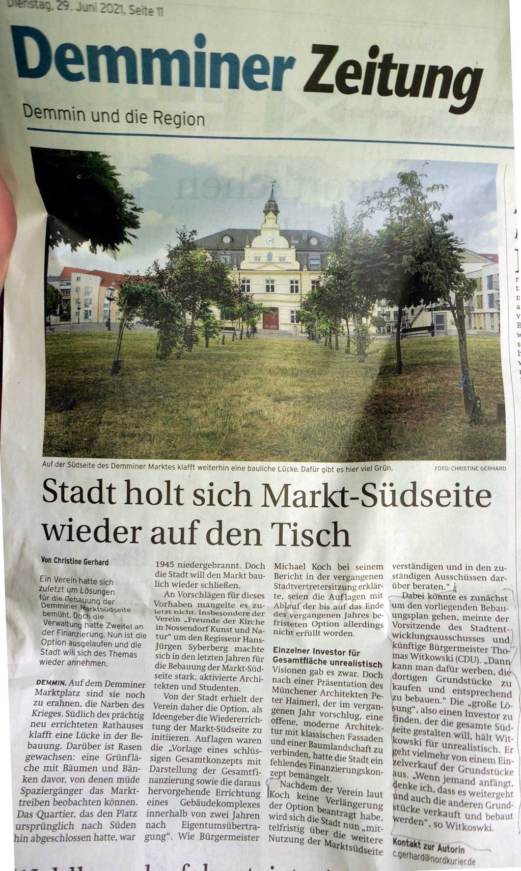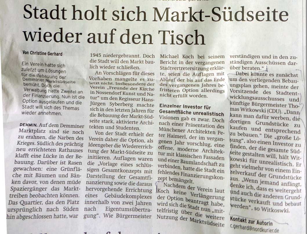 Aber. Am Ende des Artikels heisst es, jeder könne dort sich einkaufen, die Stadt werde es begrüssend dulden. In der Erwartung, dass dann etwas entstünde, was den Markt wieder begrenze und fülle, mit Leben. Wie seit 75 Jahren nicht. Und das, weil alles andere gescheitert sei. Zuletzt die Option aus Nossendorf mit seinen Architektur-Modellen aus aller Welt. Und einem Nutzungskonzept zur Finanzierung, das schon dem Protokoll der Sitzung dazu nicht vorkommt.